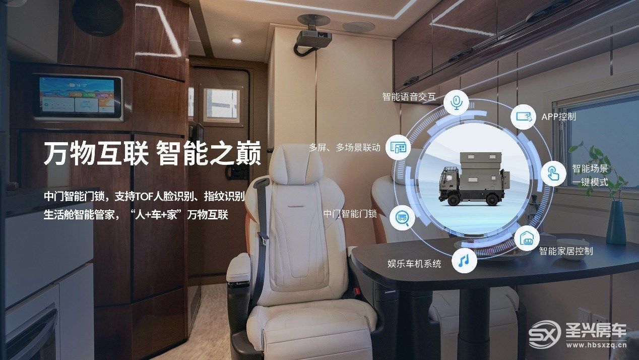 實現智能交互,專屬貼身管家:從中門進入生活艙的方式也極具科技感,智能門鎖支持TOF人臉識別和指紋識別;智能管家可將人、車、家萬物互聯,通過觸控屏或語音可實現控制車內柴暖、空調、燈光,以及查看水電量,成為提升旅程舒適度的“利器”,尊享品質生活。