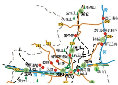 3.北線:西安-咸陽三原(城隍廟)-銅川(藥王山、耀州窯、玉華宮、照金-香山)-延安黃陵(黃帝陵)-洛川(黃土國家地質公園、洛川會議革命舊址)-宜川(壺口瀑布)-延安革命舊址-子長(鐘山石窟)-延川(黃河蛇曲國家地質公園)-榆林綏德(漢畫像石展館)-米脂(李自成行宮、姜氏莊園、楊家溝革命舊址)-佳縣(白云山)-榆林(鎮北臺、紅石峽)-神木(紅堿淖、二郎山、能源工業旅游區)等;