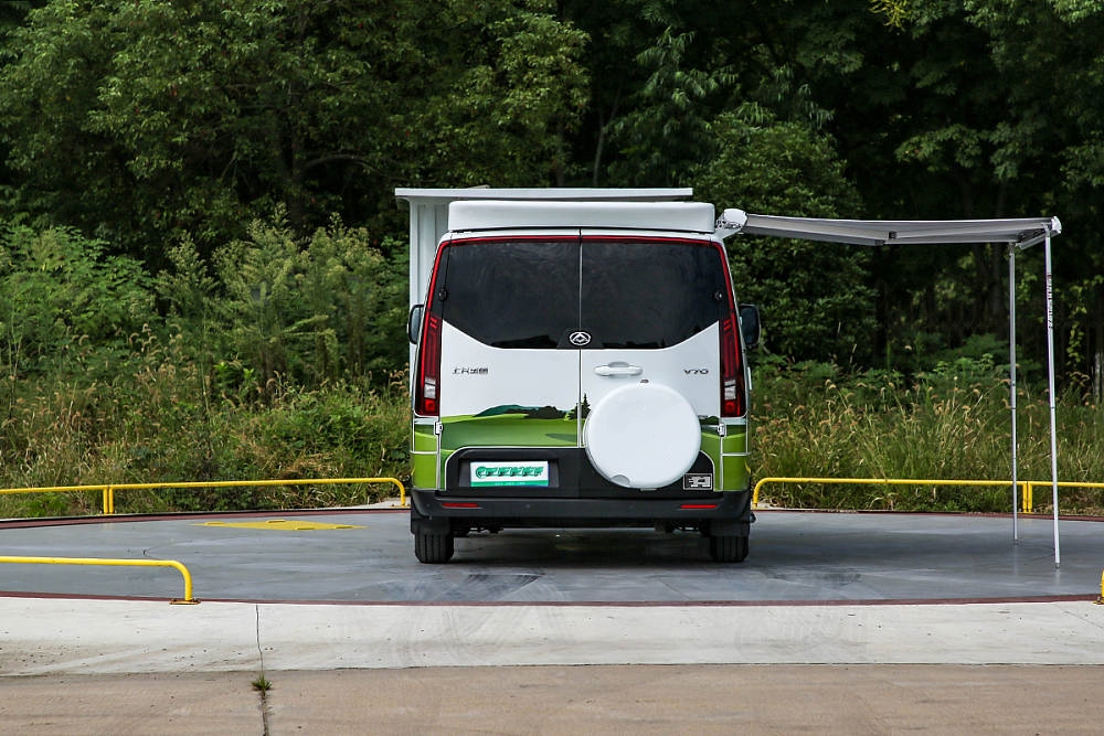 上汽大通MAXUS V70房車側提供了電源接口、注水口,保持了車身整體性,右側的戶外遮陽棚方便用戶簡單的戶外露營。