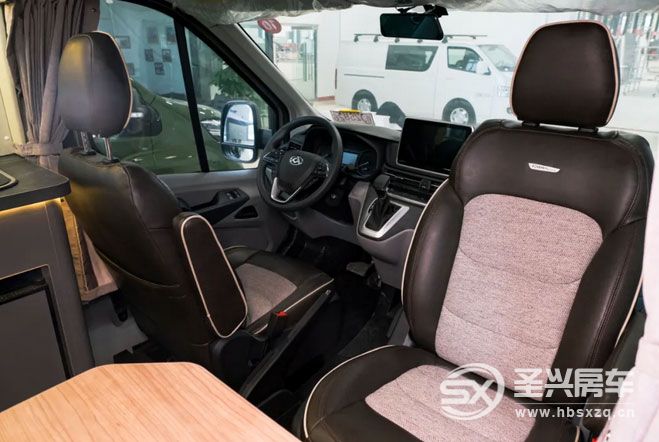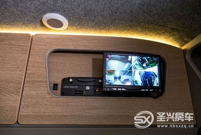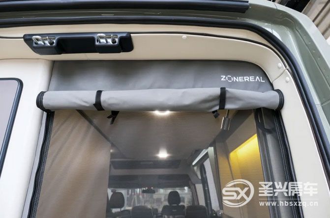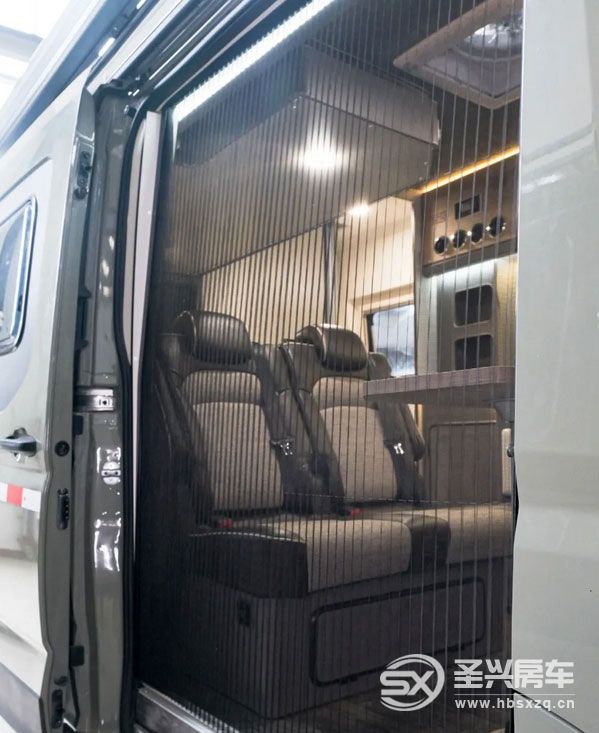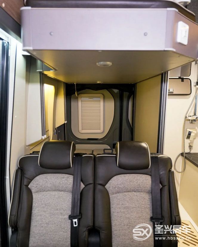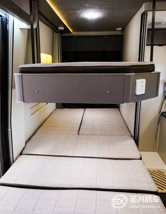 儲(chǔ)物/睡眠區(qū): 白天是雙人座椅,晚上座椅放倒,與后方床鋪形成2050×1100(mm)的常態(tài)床,上鋪是2000×1000(mm)電動(dòng)升降床。下方是大尺寸儲(chǔ)物空間。