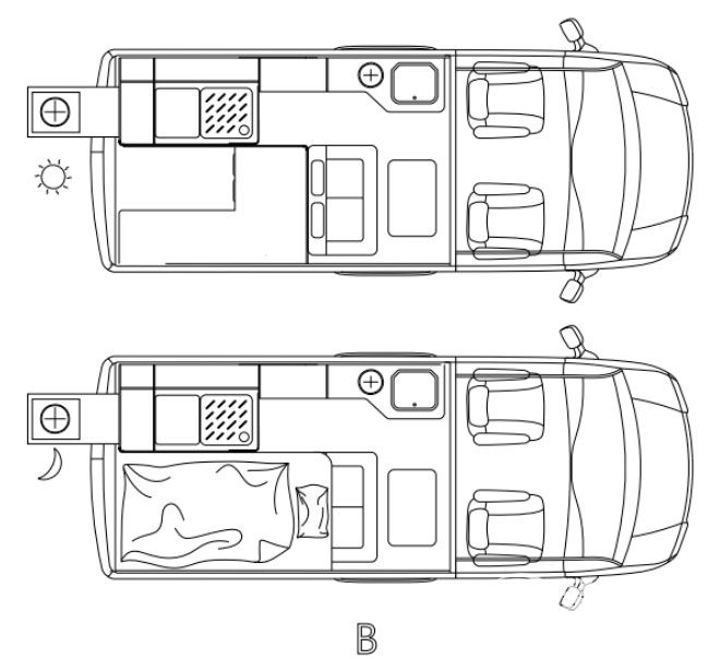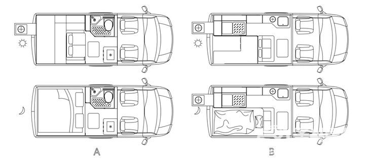 當(dāng)然,上裝設(shè)計(jì)不僅局限于以上介紹的布局,為讓房車(chē)愛(ài)好者有更好的體驗(yàn),以下兩款布局可選。A版是大橫床的設(shè)計(jì),B版是縱床上下鋪的布局。