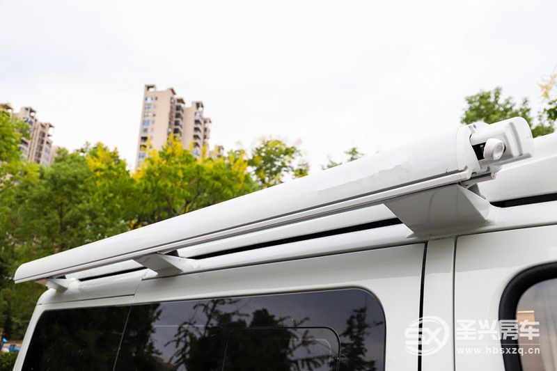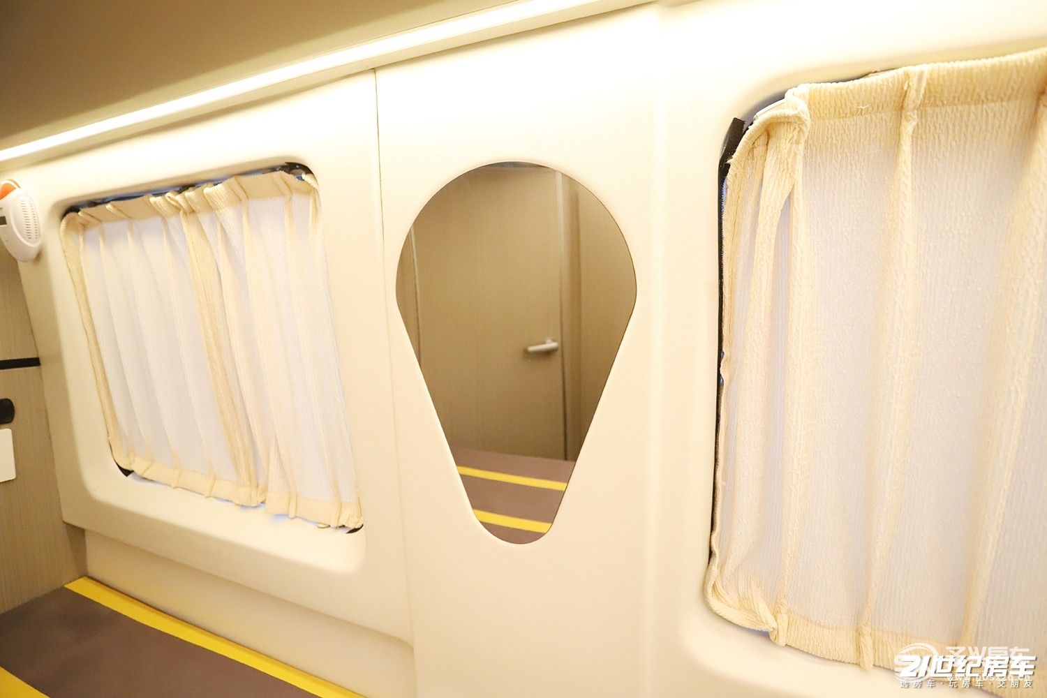 車尾對開門形式,最高打開角度90度,直接看到了開放式的衛生間和縱床的一個通風口,晴天駐車的時候可以可以晾曬一下衛生間,避免長期使用產生的潮濕和霉變。