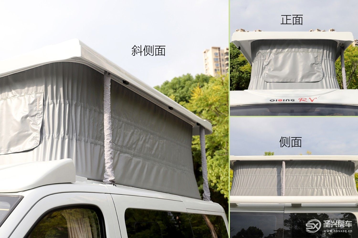 在大通V80原有基礎之上,車頂切割之后安裝了一款彈出式車頂,四角采用液壓柱進行支撐,平行且同步升降從而確保了穩定性。升頂房車最難克服的問題在于:保溫和隔熱。這款車的連接篷布外層為防刮、防水層,中間位保溫層,冬季在溫度不是特別低的地方駐車還是可以保證的,前提是要打開暖風或者空調。