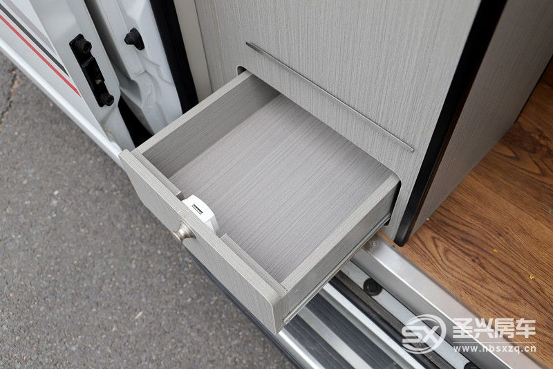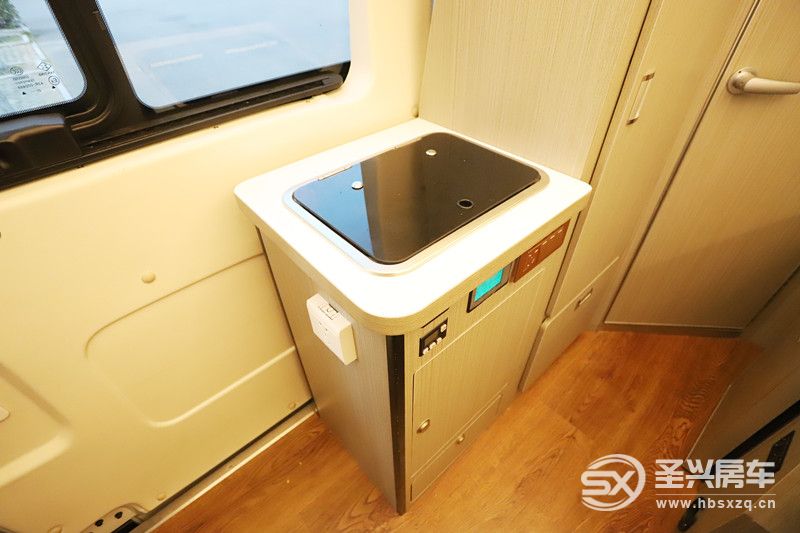 作為一款B型房車,外置廚房配置了兩套,如果使用原車油箱的柴油,那么車尾備胎式廚房可直接使用,如果使用電能源,那么右側中門位置的隱藏置物板可以使用電磁爐,在個別比較小的停車位,車尾廚房派不上用場,使用電磁爐更合適。