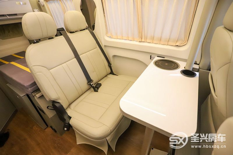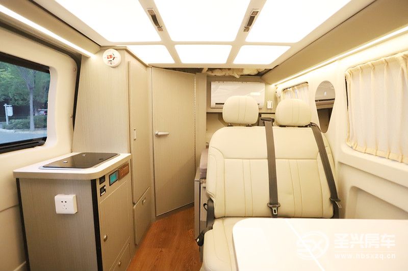 車內布局非常簡單,米白色的內飾配色,基本沒有別的雜色,在暖色燈光的襯托下,整體氛圍比較純粹。生活區為前置雙人單排座椅+中置廚房+后置縱床+衛生間的基礎格局,當彈出式屋頂打開之后,車內的凈高度可以達到2米,不影響在車內的正常走動。總體的感覺來說升頂B型房車比常規硬頂B型房車頭頂空間更舒適一些。駕駛室右側的雙排副駕駛座椅在有需要的時候可以向后旋轉,與會客區雙人座椅形成一個簡易的會客區。