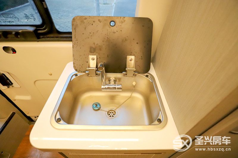 車內廚房區只能算是閹割版,廚臺面積比較小,只配備了一款不銹鋼洗菜池,其他烹飪功能移植到了車外。