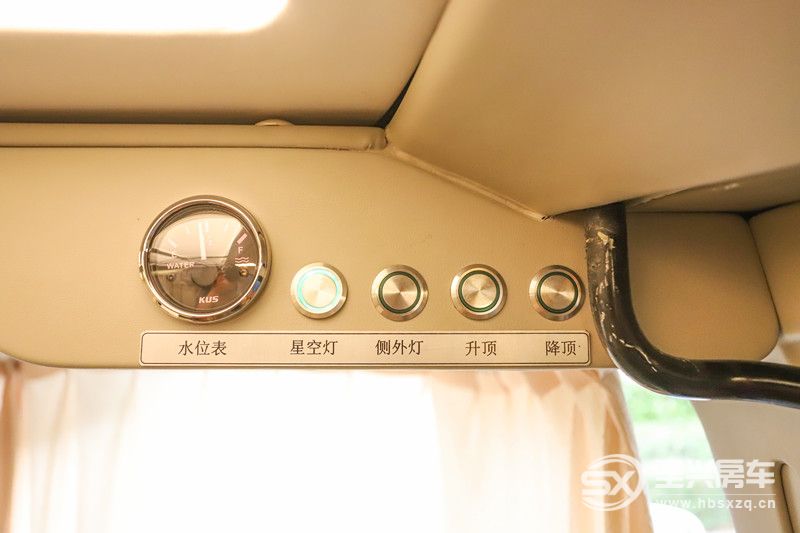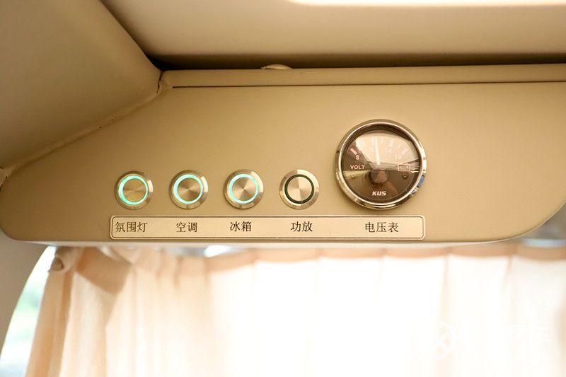 車內兩側的側壁板上帶有按壓式按鍵,集成了車內的所有用電設備開關。關于這款車的電路方面,標配的是200Ah鋰電池組,3000W逆變器,可以另外選配400Ah和600Ah鋰電池兩個配置包以及車頂400W太陽能板。