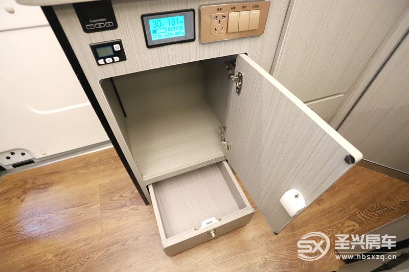 衛生間部分維持基本夠用的狀態,為了節約空間,配置的是一款便攜式馬桶,單獨配備有淋浴系統。水路方面,這款車配備了70升凈水箱和20升熱水箱以及45升灰水箱。