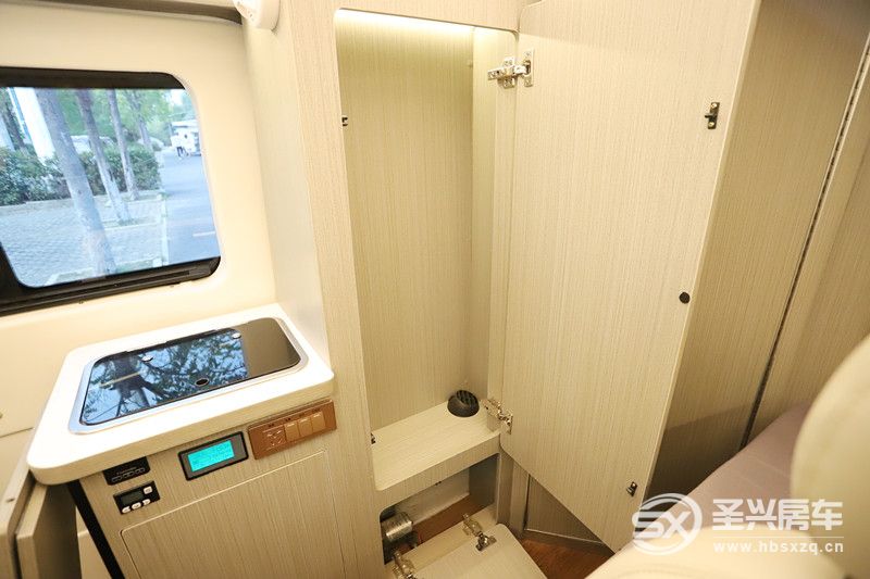廚房櫥柜內和右側的衣柜是車內最集中的儲物空間,選擇這款車基本上也就選擇了一種需要資源優化配置,“斷舍離”的生活方式,畢竟B型房車的儲物能力太弱了,當然好的地方是這款車內竟然配備了衣柜,并且空間還算不錯。
