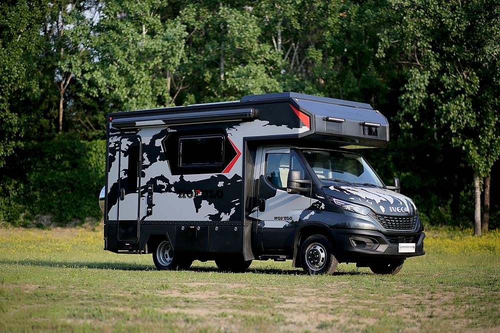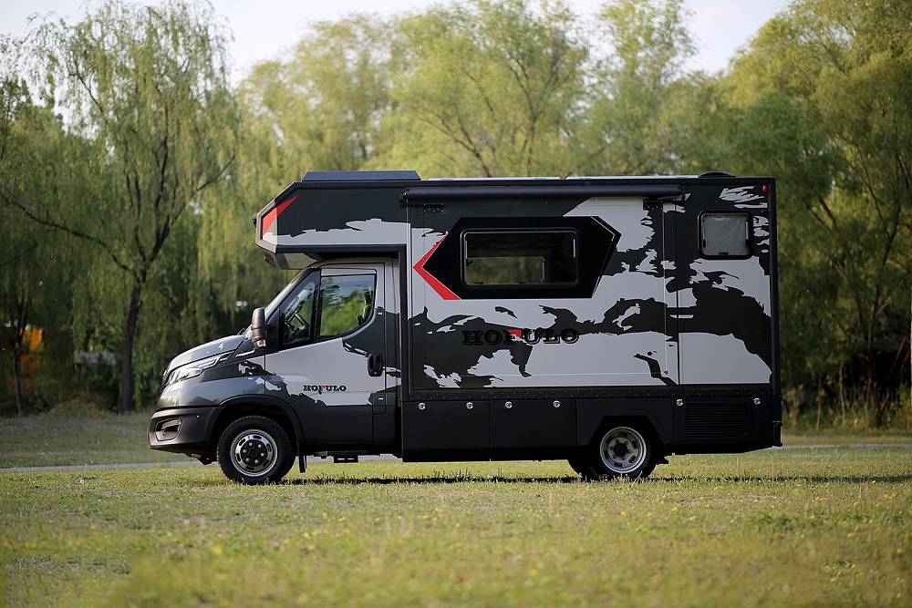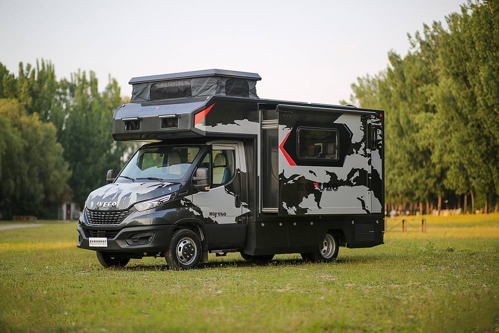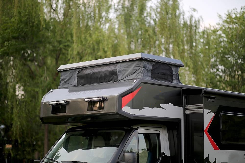 面對市場上眾多同級C型競品房車,論及拉花、彩條以及車身涂裝的個性化制作,依維柯這款全新車型絕對榜上有名。雖然進(jìn)口依維柯底盤只是后驅(qū)系統(tǒng),但這種足夠野性、也足夠讓人一見就能傾心的硬朗氣息,不免會把它當(dāng)做四驅(qū)越野房車來對待。為了降低車身整體高度,勇者房車將軟升頂機(jī)構(gòu)植入C型額頭位置,這樣它的最大高度控制在2990mm。