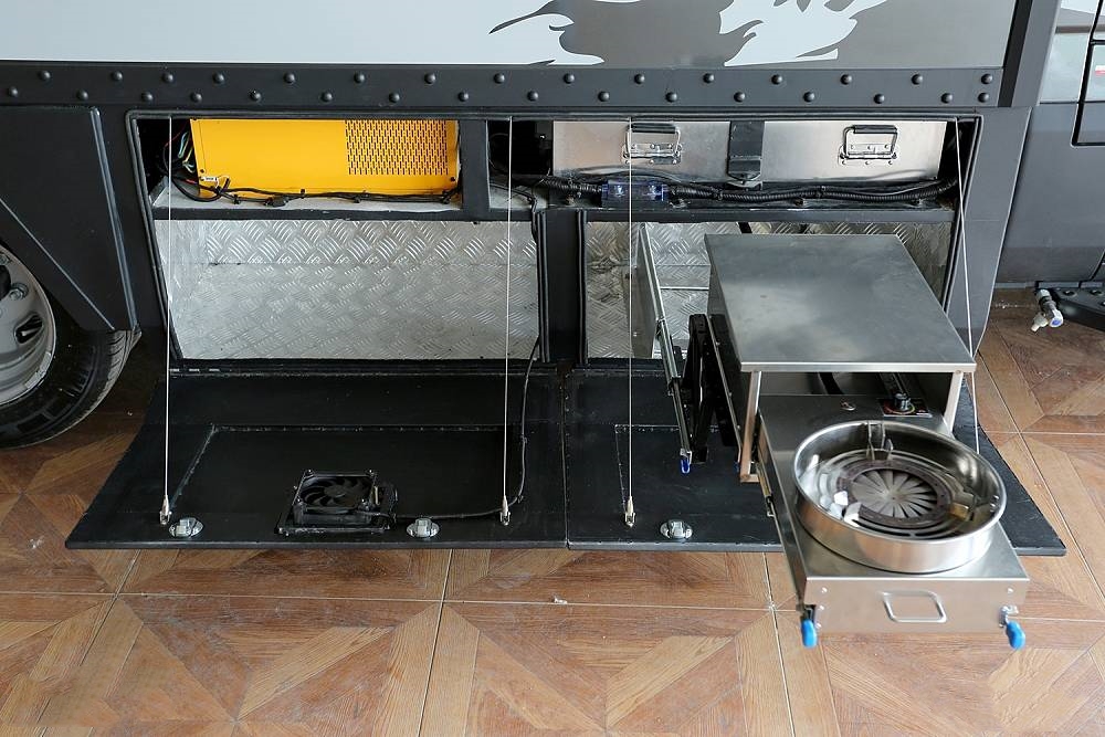 車身右側(cè)是這款車的外置廚房,全金屬的側(cè)裙同時能夠很好的保護(hù)車內(nèi)的設(shè)備,外置廚房配備的是一款柴油灶,柴油來源于原車100升油箱。