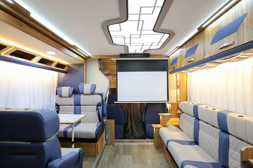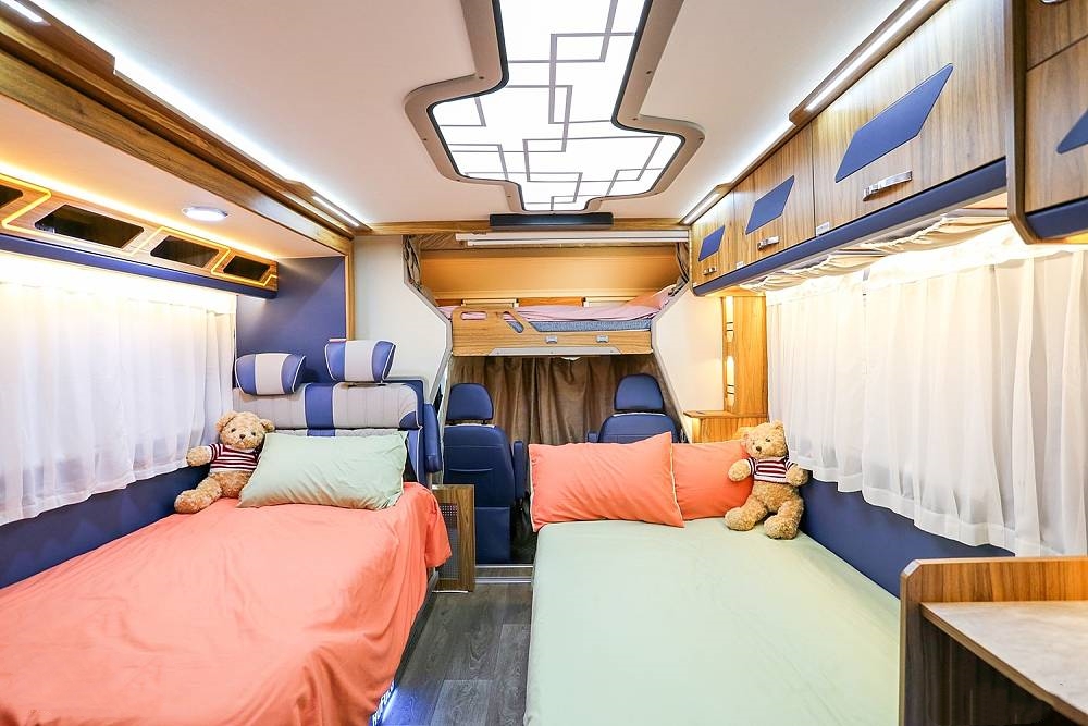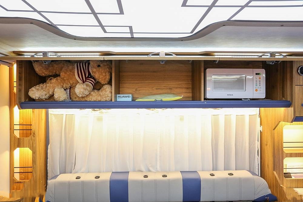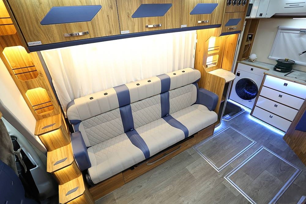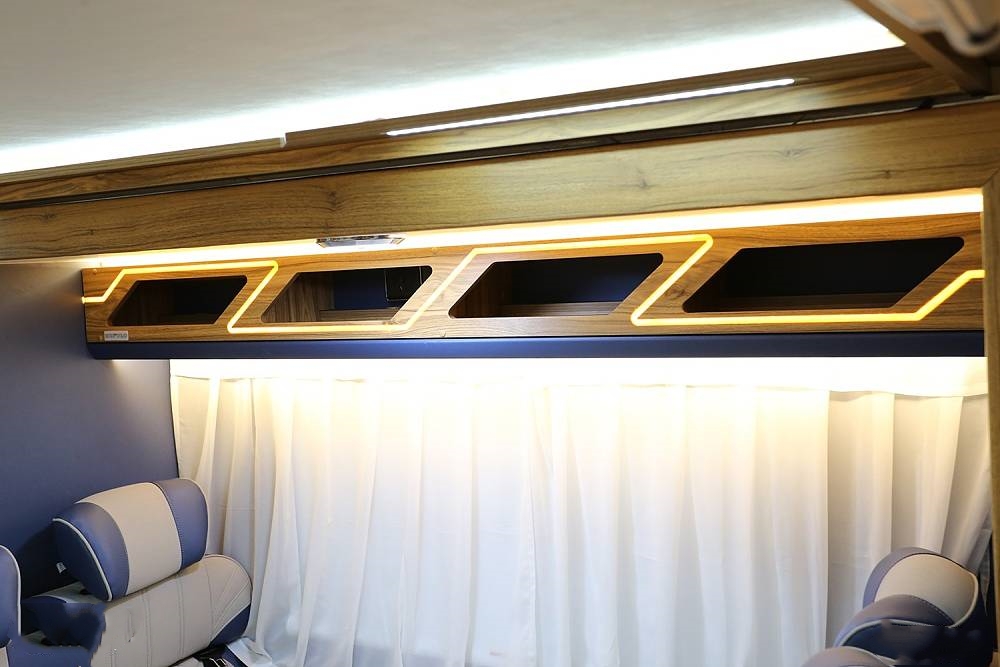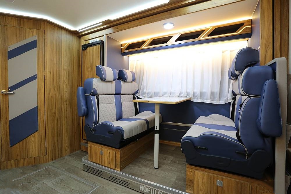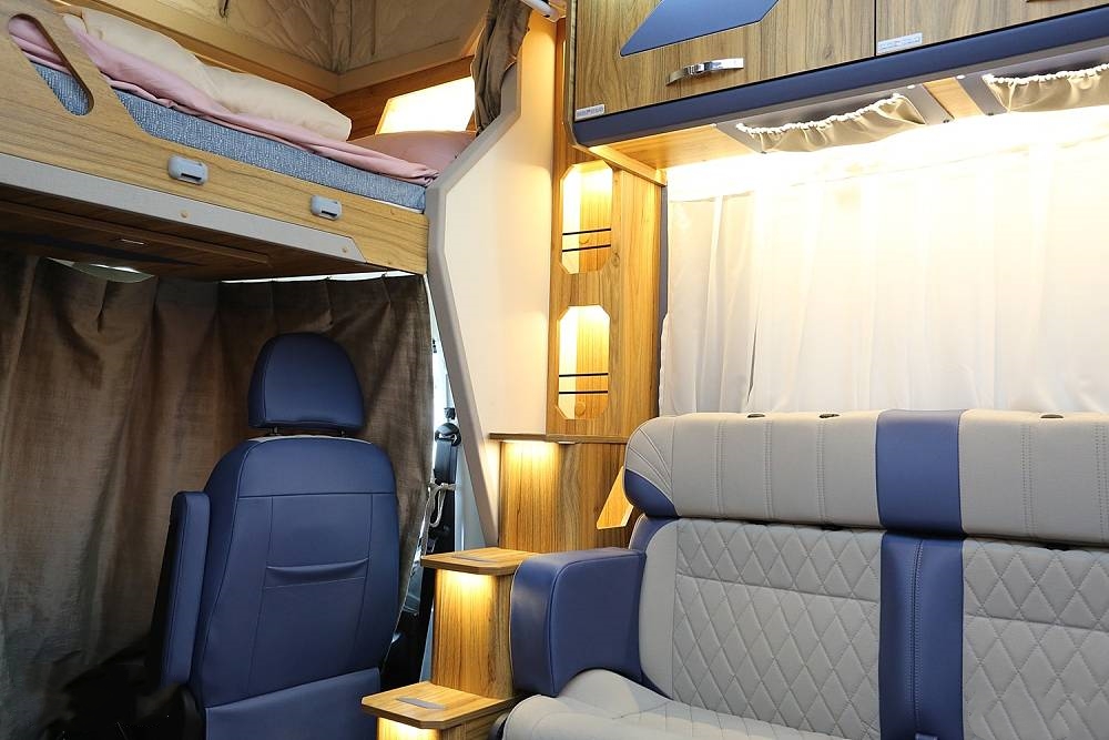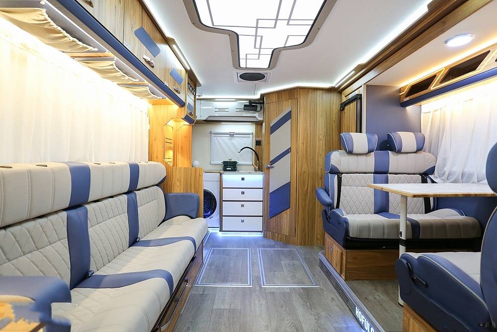 內(nèi)飾方面,勇者房車內(nèi)部采用藍(lán)白內(nèi)飾風(fēng)格作為全新的設(shè)計,有點海洋系的感覺。整體感覺來說,白藍(lán)配色觀感清新,加上原木色的板材飾面,更加原生態(tài)。吸頂式造型頂燈與四周吊柜造型相呼應(yīng),頂燈與氛圍燈帶相襯托的整體燈光效果,使得夜晚的車內(nèi)空間充滿了居家溫馨感。布局方面,整車以額頭床+中置長條沙發(fā)+4人會客區(qū)+車尾廚房+衛(wèi)生間布局,對于這款布局我們比較常見,但對于勇者這款房車來說,是第一次嘗試,側(cè)向沙發(fā)和4人會客區(qū)座椅全部來自于乘用車的座椅標(biāo)準(zhǔn),安全性上得到了保證。