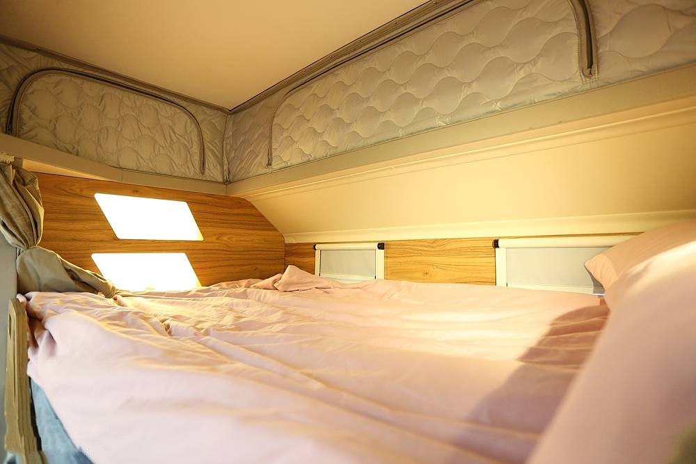 再來看看這款搭在額頭區(qū)域的“帳篷床”,它的尺寸為1950×1200(mm),睡在這里可以不必再擔(dān)心一不小心抬頭就磕頭的風(fēng)險,即便是挺直腰,頭頂?shù)目臻g依然綽綽有余。平時不升頂前提下,額頭前側(cè)的兩張小側(cè)窗可以起到一定的采光作用。