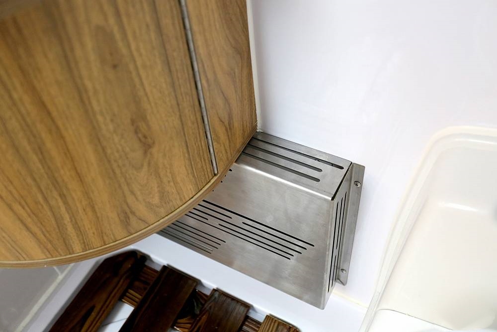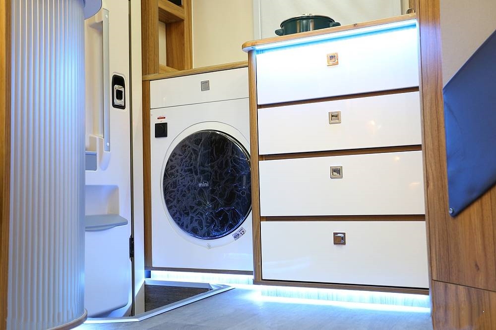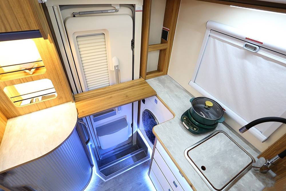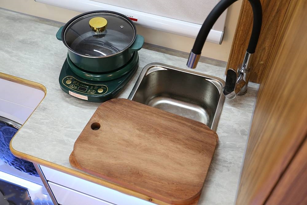 廚房配備洗菜池、冷熱水龍頭、切菜板、活動式電磁爐、進(jìn)口大宇微波爐。后上門布局的房車尾置廚房一般都采用異形的操作臺設(shè)計,留下的缺口由一塊折疊板進(jìn)行填補(bǔ),實際上操作臺的尺寸和補(bǔ)齊的整個操作臺大小一致。這款車將洗衣機(jī)也集成到了櫥柜之內(nèi),相對使用要便捷一些,在車外就能操作。另外,四層抽屜也提供了充分的儲物空間。