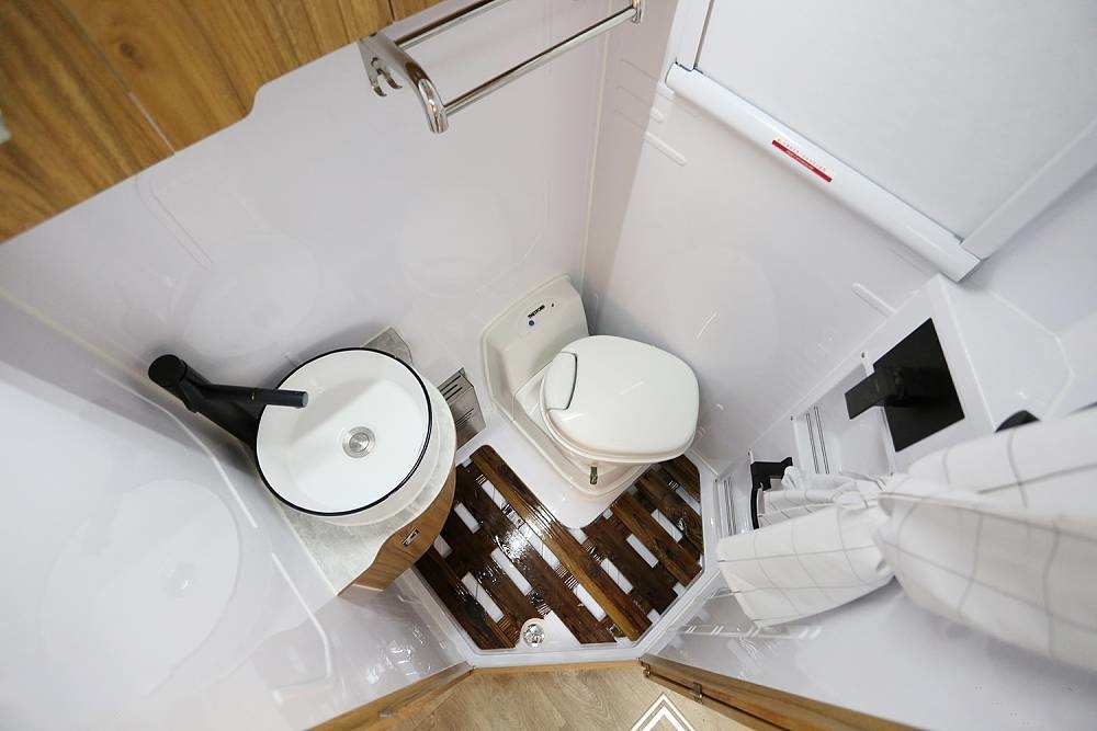 衛(wèi)生間簡潔明了,搭配一款圓形陶瓷洗臉池、頂部雙向換氣扇、對開門洗漱品儲物格、毛巾架以及化妝鏡和獨立的淋浴花灑。水路系統(tǒng)方面,勇者房車配備的是230升凈水箱、80升熱水箱、95升灰水箱。