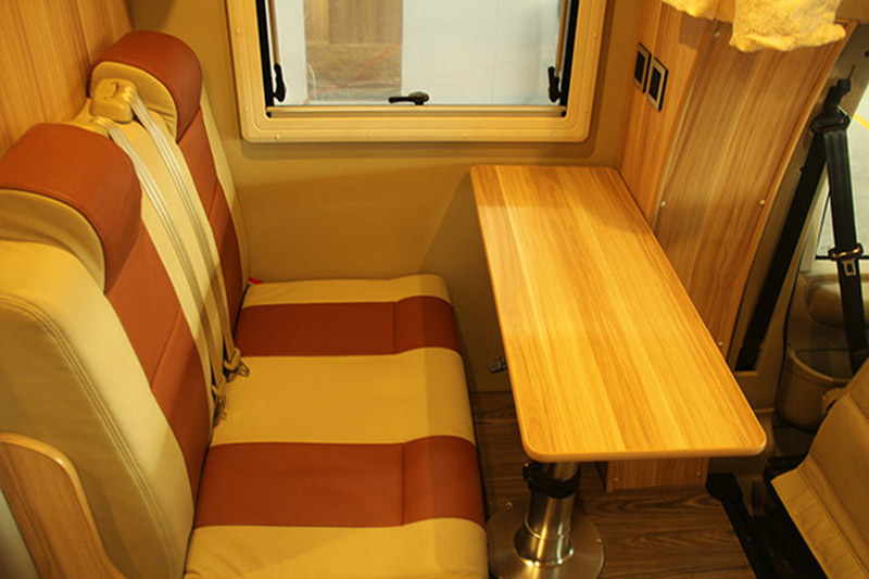起居室的前部分是一個(gè)簡(jiǎn)單的沙發(fā)和小餐桌,同時(shí)正副駕駛座椅可以向后旋轉(zhuǎn),與后面的桌椅形成一個(gè)小型的會(huì)議室。小餐桌可以進(jìn)行升降,當(dāng)將至最低處時(shí),可以在此處拼合成一個(gè)簡(jiǎn)單的躺椅。