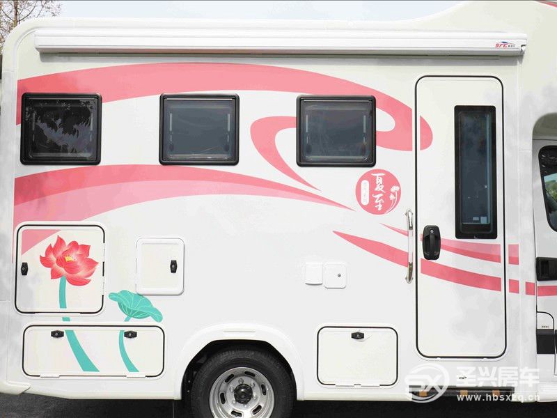 作為依維柯雙拓前開門系列的旗艦版,外觀有著滿滿的中國風,車身以白色涂裝為主色調,在輔以東方紅為點綴,富有田原風光的荷花點綴其間,走在路上,它就是風景!