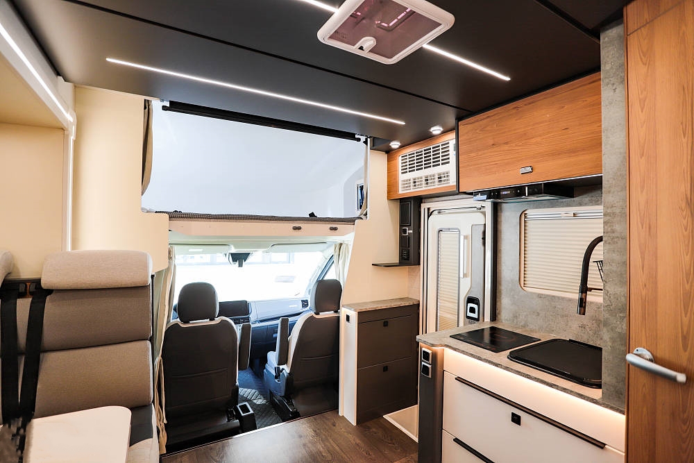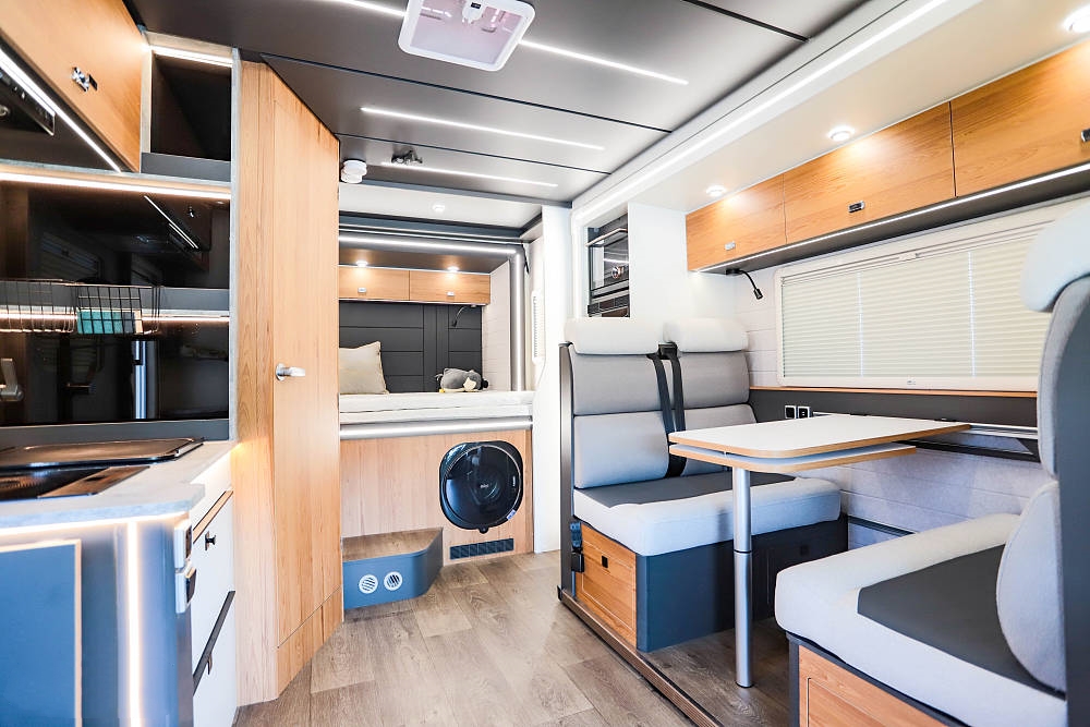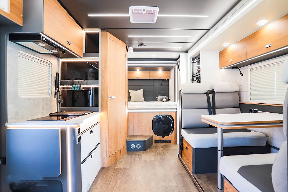 設計拓展機構的妙處在于,駐車時車廂面積得以最大化拓展。只需按鍵操作拓展艙便徐徐伸出,將房車內部空間瞬間打造成一個寬敞舒適的居家環境。此時,會客區域、開放式廚房以及床鋪休息區都擁有了更多的活動空間,仿佛將家搬到了戶外。而當駕駛或泊車之時,只要一鍵收回拓展艙,就能緊湊如常,絲毫不影響行駛或停靠的便捷性。