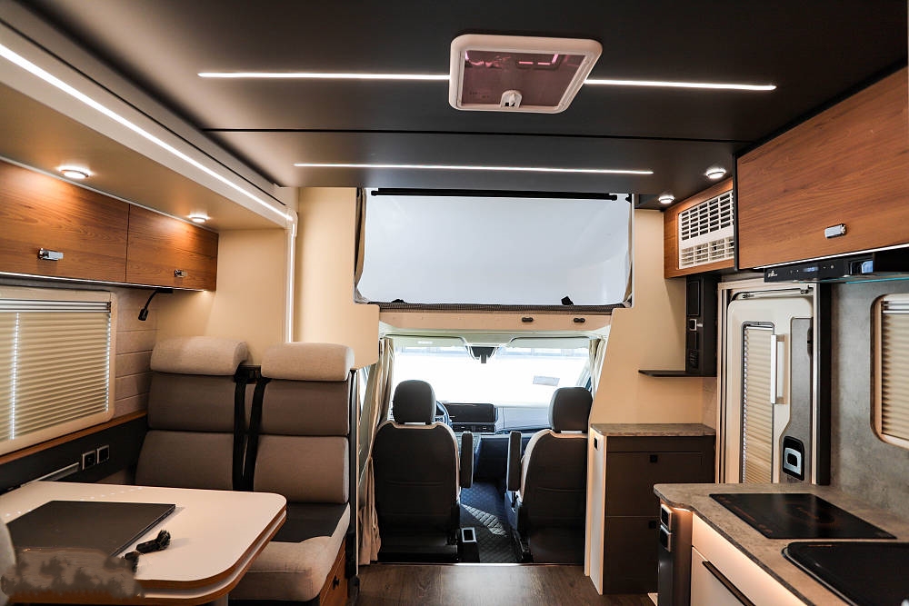 會客區橫向空間表現優異,餐桌表面是白色原木紋理并配備延長桌板,打開后更方便日常就餐娛樂;雙卡座沙發座椅下方內有乾坤,各內置一組大容積抽屜,充分利用零散空間提升儲物效率。餐桌降低后還可與沙發組合成一張臨時床鋪使用,超大尺寸外推窗為客廳提供足夠的采光和通風效果,同時也可以欣賞車外的風景,為旅途增添樂趣。