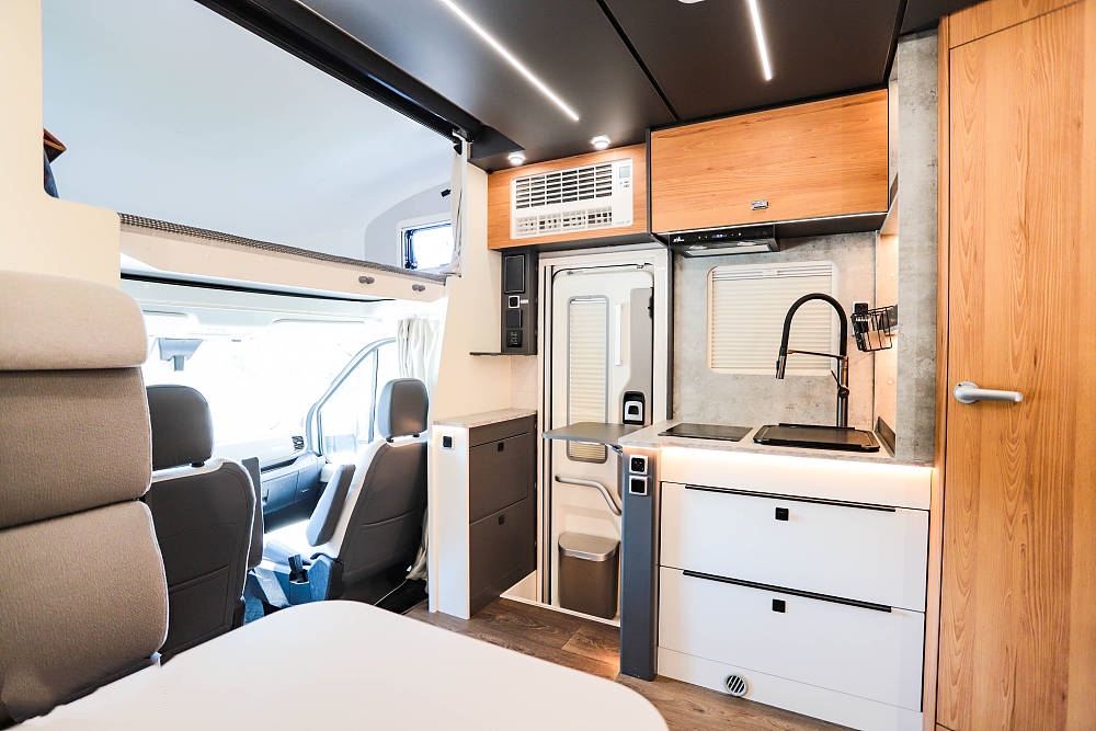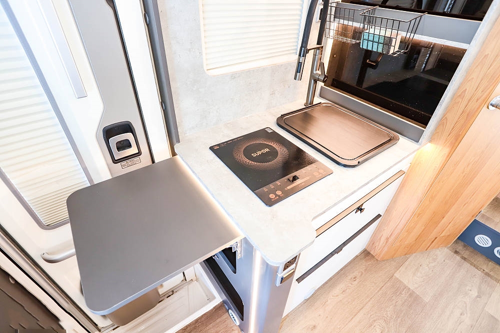 廚房區位于沙發區對側緊鄰房車中門,一字型操作臺帶有折疊式擴展臺面,配備帶蓋板的不銹鋼洗菜盆、全尺寸龍頭、電磁爐,臺面上方配有油煙機、通風窗和一組吊柜,下方設置兩組抽屜可以收納廚房調料、碗筷等。