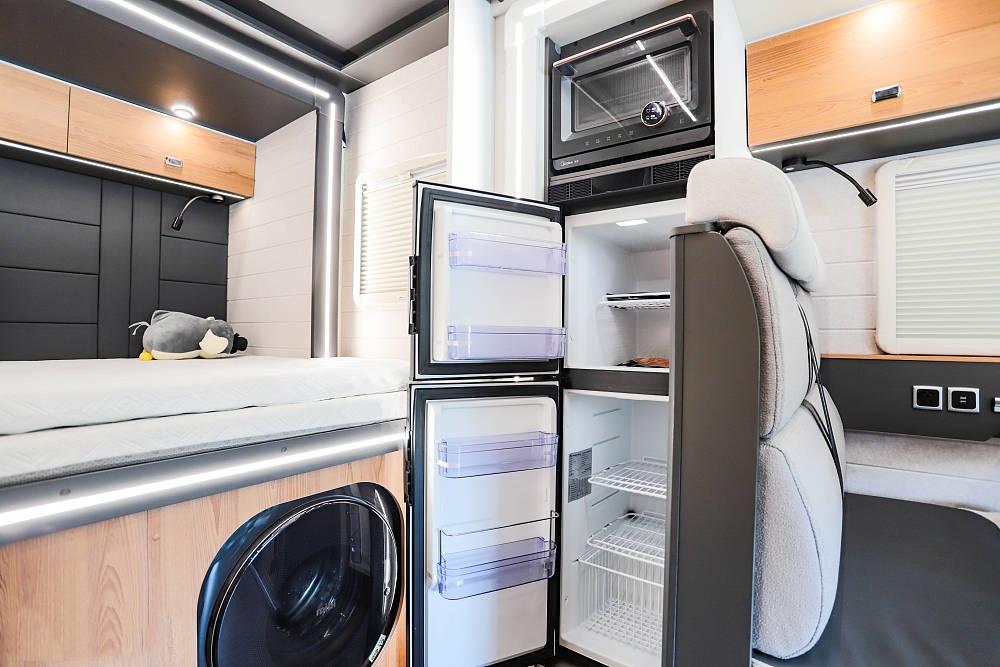 135L阿雷納房車專用冰箱和美的微烤一體機一起放在了對卡座沙發區的后側,雙門大容量冰箱滿足了食物冷凍和冷藏的需求,為旅途中的用餐帶來便利。