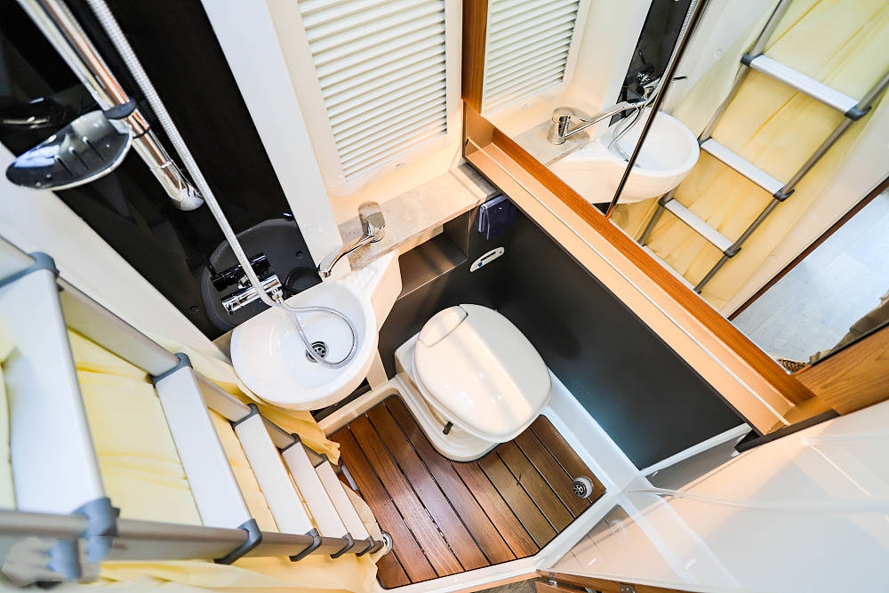 駕駛室上方是常見的大額頭雙人床,可以輕松睡下2名成年人,帶兒童防護網保證嬰幼兒睡眠安全,額頭床兩側各配有一個外推窗,保證采光和通風效果,原車附送全乳膠復合高回彈床墊睡感舒適。