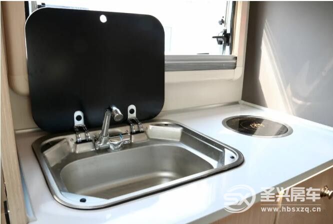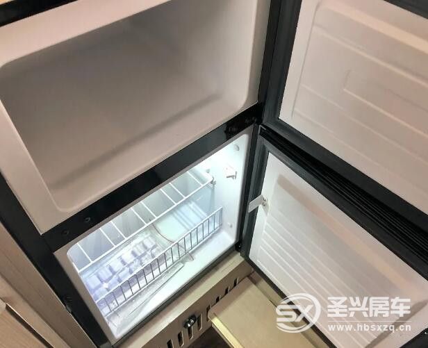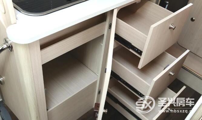 廚房區(qū)位于車(chē)廂中部,配備洗菜盆、嵌入式電磁爐、抽油煙機(jī)、85L雙開(kāi)門(mén)冰箱。電磁爐下部設(shè)置了三層儲(chǔ)物柜,可放一些廚房常用品。如果您還覺(jué)得車(chē)內(nèi)的儲(chǔ)物箱不夠用,頂部?jī)蓚?cè)也布置了并排吊柜,同時(shí)也提高了空間的利用率。