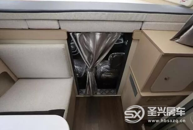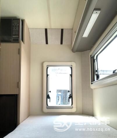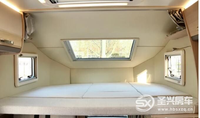 房車(chē)頂部額頭設(shè)置了雙人床,尺寸為1.9*1.7米,可滿足2名成年人休息使用。床頭設(shè)置閱讀燈,床簾、插座等,方便床上看書(shū)、充電等。床頭兩側(cè)為對(duì)開(kāi)窗均可開(kāi)啟,保證了采光通風(fēng)。額頭天窗更適合在夜晚觀看星空。紗窗、遮陽(yáng)簾的設(shè)計(jì),避免陽(yáng)光直曬和蚊蟲(chóng)防范的同時(shí)也注重隱私保護(hù)。