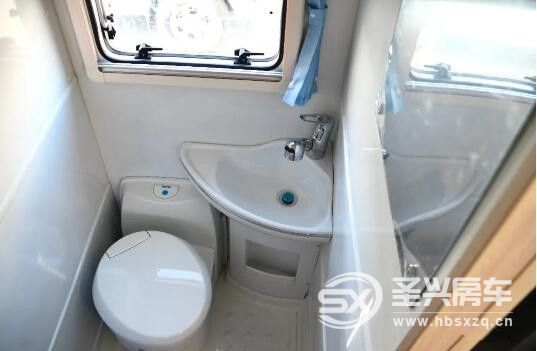衛(wèi)生間位于車(chē)廂尾部,固定坐便器、洗手池、可拉伸式淋浴器、梳妝鏡、儲(chǔ)物格一應(yīng)俱全,而頂部也配備了雙向換氣扇,可以通風(fēng)使用,保持空氣流通。