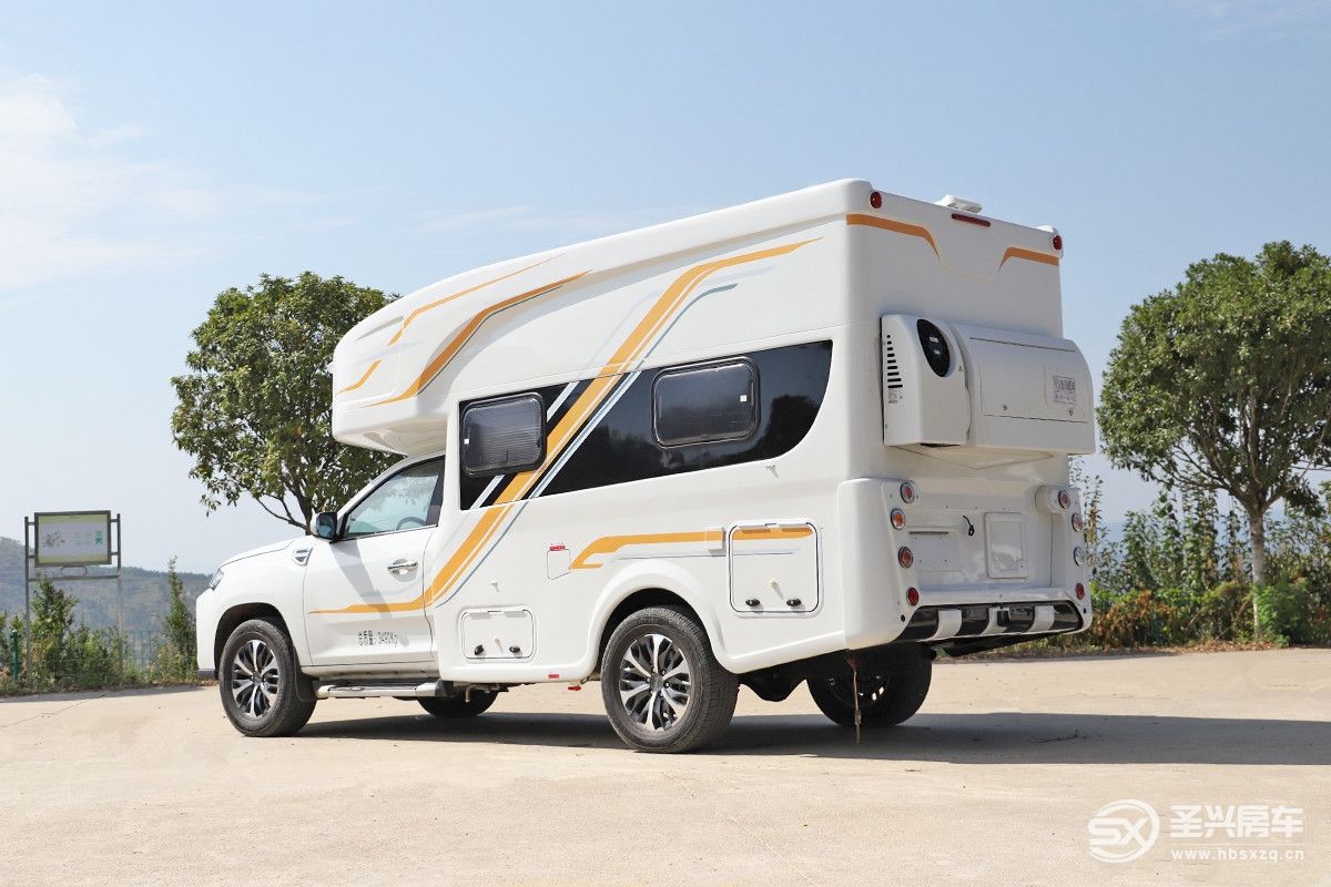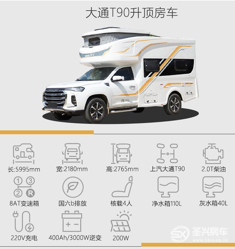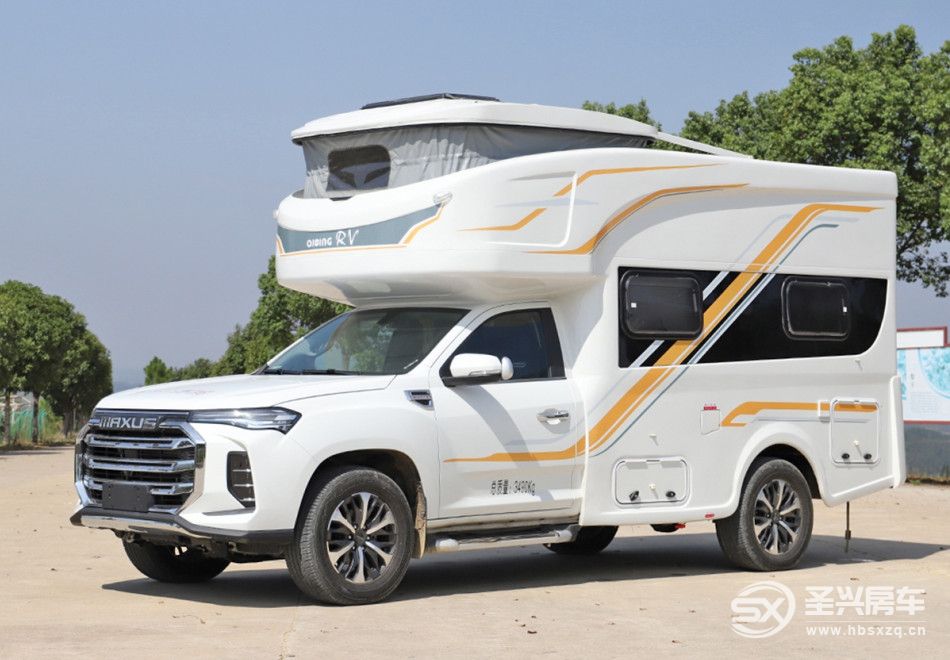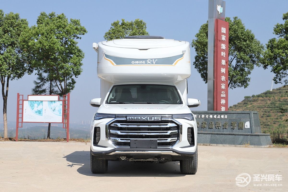 大通T90廂體采用鋁合金沖壓成型廂體,在不升頂?shù)那闆r下,整臺(tái)車(chē)的外觀與常見(jiàn)的皮卡房車(chē)幾乎沒(méi)有區(qū)別,底漆為房車(chē)常見(jiàn)的白色,同時(shí)車(chē)側(cè)配有黃色拉花。