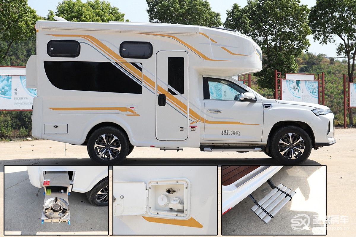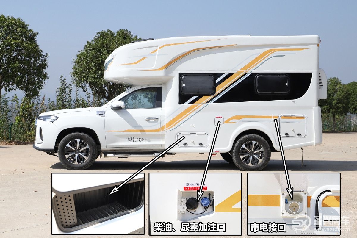 車(chē)身右側(cè)主要集成部分戶外露營(yíng)配置,包括車(chē)尾的戶外柴油灶、頂部3米遮陽(yáng)棚、取水口等,中門(mén)位置設(shè)置了電動(dòng)一階踏步,方便用戶上下車(chē)。