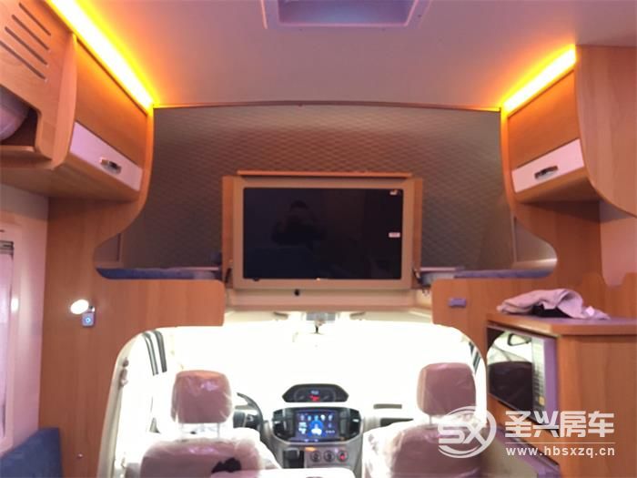 打開(kāi)電動(dòng)踏步,進(jìn)入會(huì)客區(qū),會(huì)客區(qū)采用了L型卡座設(shè)計(jì),中間搭配升降餐桌。沙發(fā)采用了豪華布藝設(shè)計(jì),盡顯高端。在前方配備了32寸網(wǎng)絡(luò)液晶電視,讓您在旅途中也不耽誤追劇。