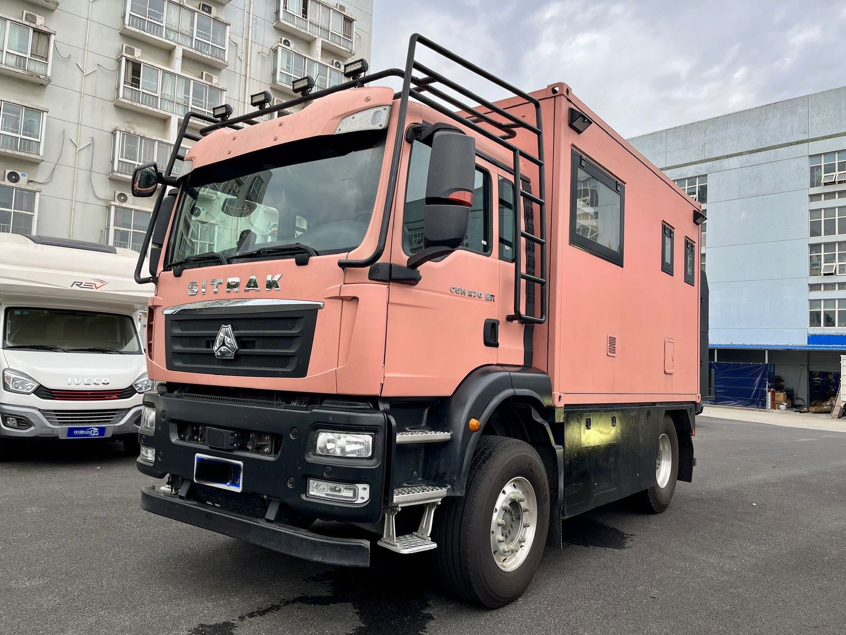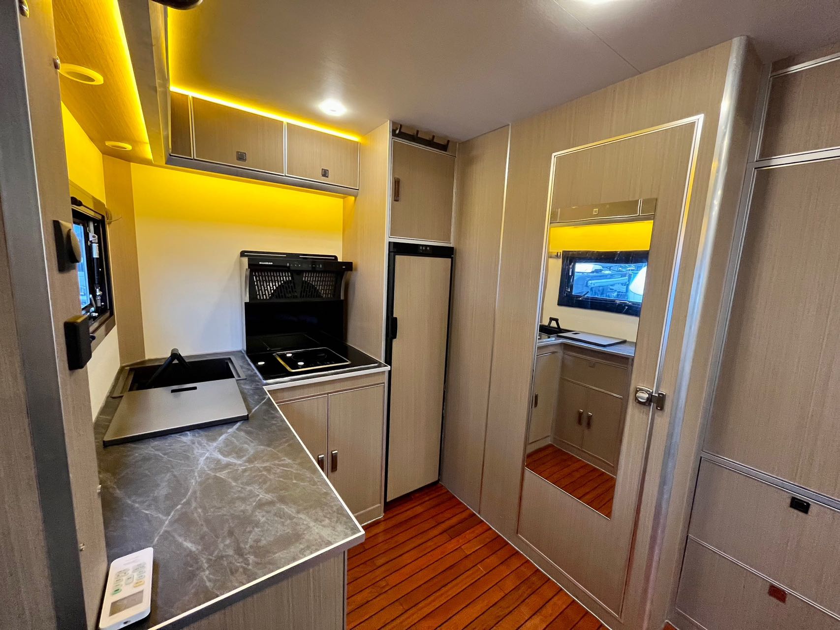 【戶外配置】:220V市電接口,重力加水口,電動戶外遮陽棚,中門密碼鎖,五階上車踏步,電動升降儲物箱和摩托車架,車頂射燈