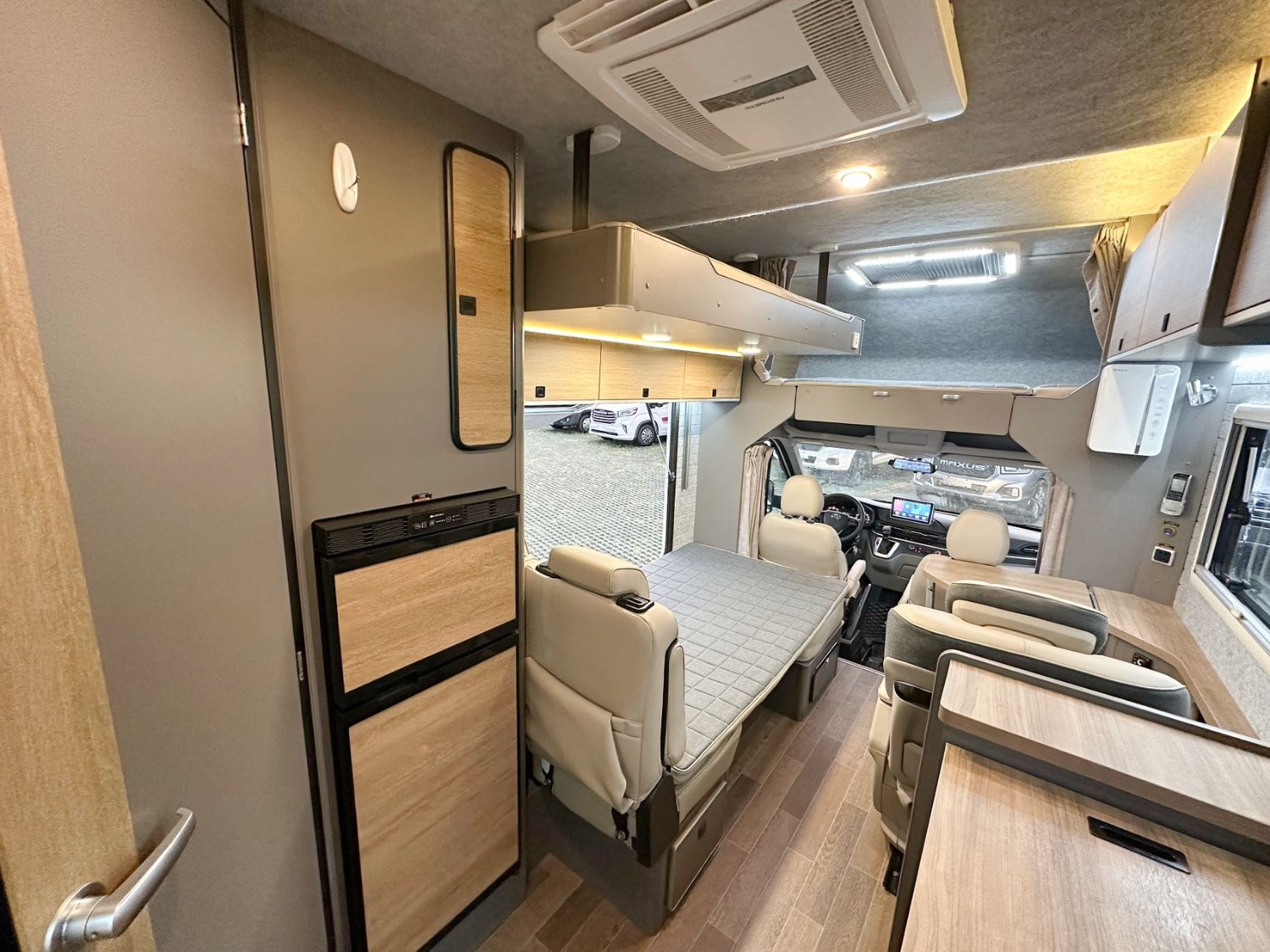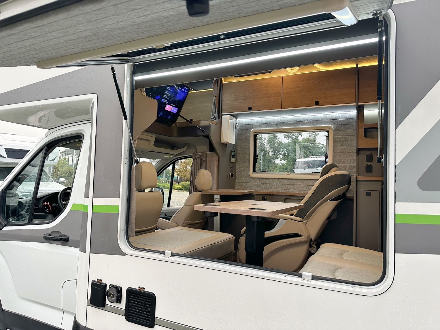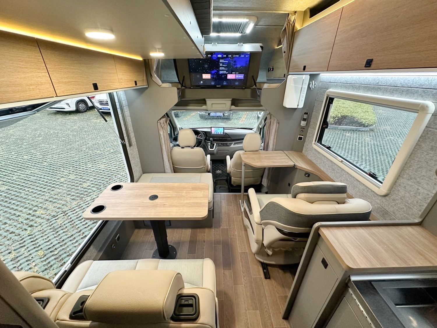 電器配置:頂置多美達IBIS4變頻空調(diào)、燃油鍋爐、網(wǎng)絡(luò)電視機、航空座椅、電動吊床、卡座拼床、額頭大床、隱藏式廚房操作臺、洗臉池、洗菜池、洗衣機、微波爐、電磁爐、多美達旋轉(zhuǎn)抽拉馬桶、淋浴花灑、電動換氣扇、超大側(cè)邊窗、新能源充電口+220家用充電口、戶外抽拉柴油灶、戶外遮陽蓬、菲亞瑪上門扶手、電動踏步。