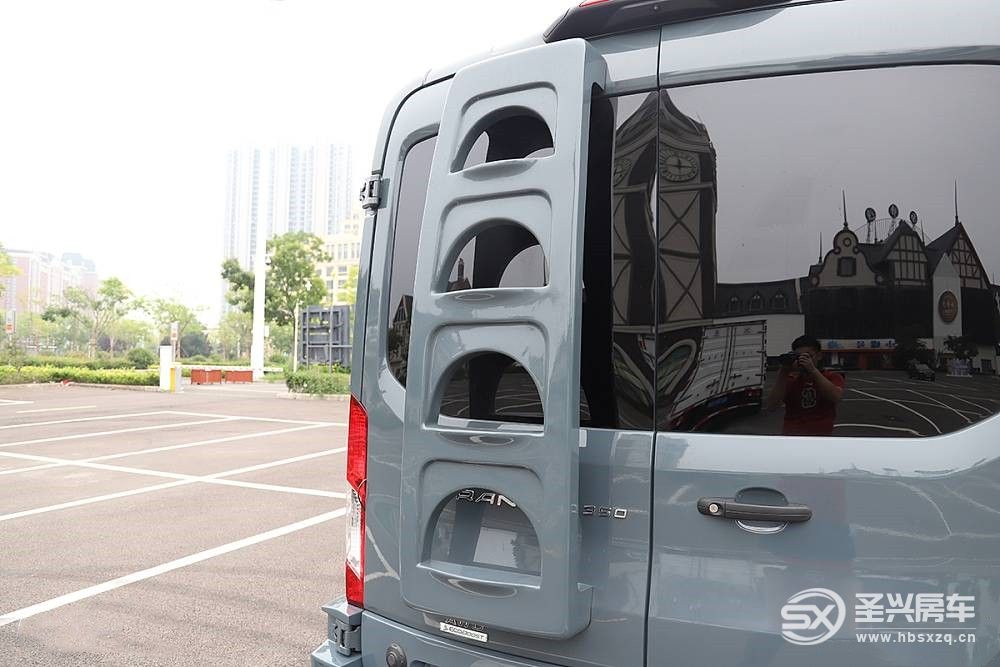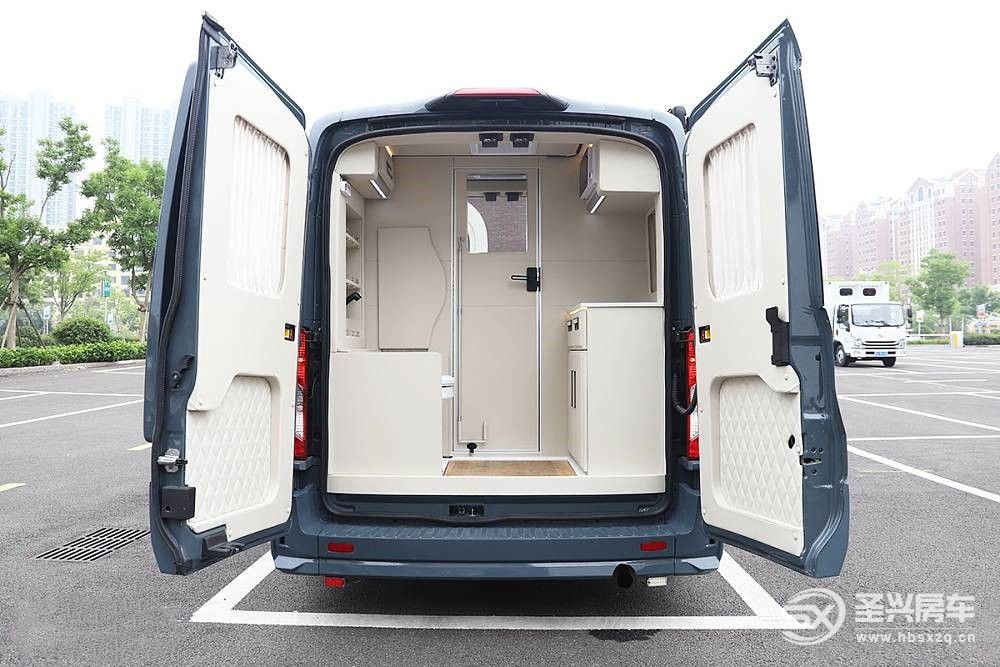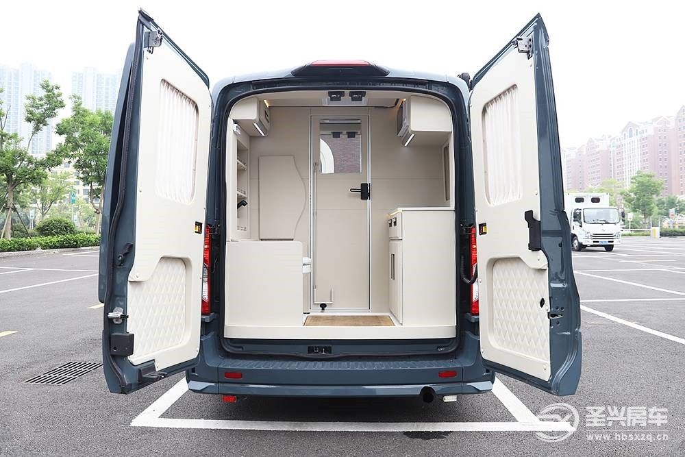 進口福特全順車尾采用對開門形式,車門鉸鏈的剛性強度也要比江鈴福特全順強,配置上福特征服者配備尾部爬梯和車尾攝像頭。打開尾門是廚衛區,等到我們進入生活區在為大家講解。