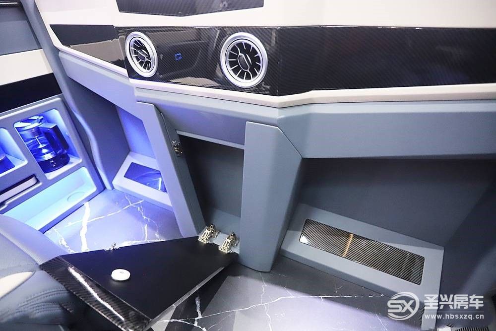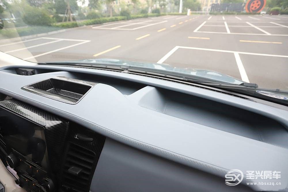 駕駛室部分進行了全方位的皮質軟包和碳纖維水轉印飾板裝飾,看上去豪華舒適同時與生活區風格統一。
