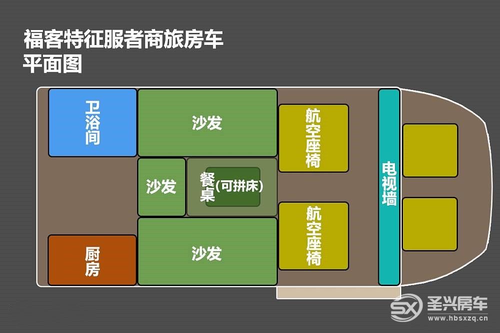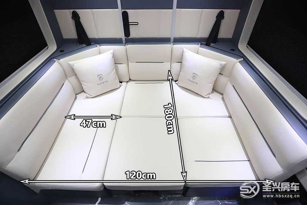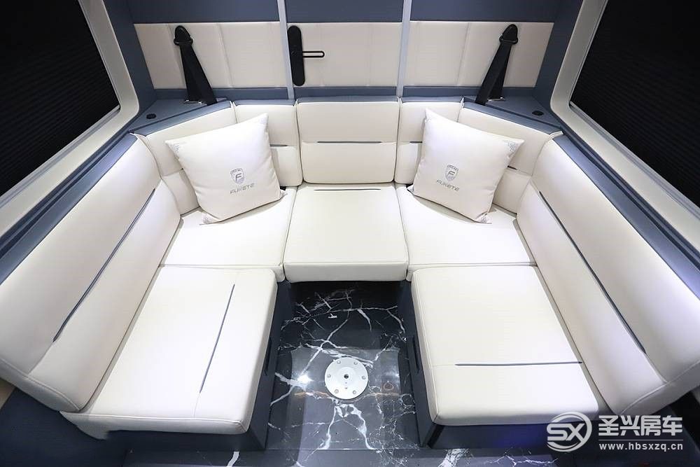 商旅車即商務、旅居車型于一身,福客特征服者內部布局包括前置商務座、中置會客區、尾置廚衛區,其中會客區支持拼接床鋪,駐車時可供用戶休息。