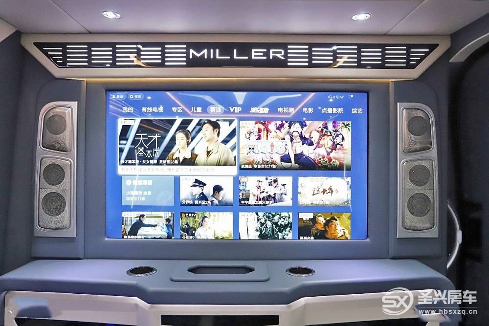 生活區與駕駛室通過屏障隔開,中間位置既是通艙窗口,升降電視也在該區域,兩側配備包括低音、中音、高音等多組揚聲器,可為車內帶來更高級的音樂質感。