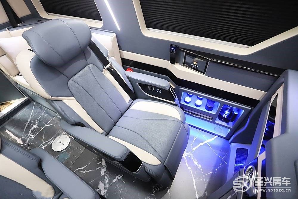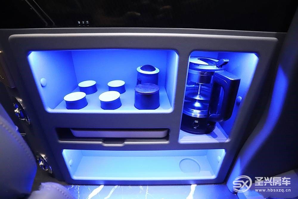 在左側商務座椅旁邊配有完整的茶具,內部嵌入藍色氛圍燈,與客人交談時,喝茶、品茶更能拉近用戶與客戶之間的距離。