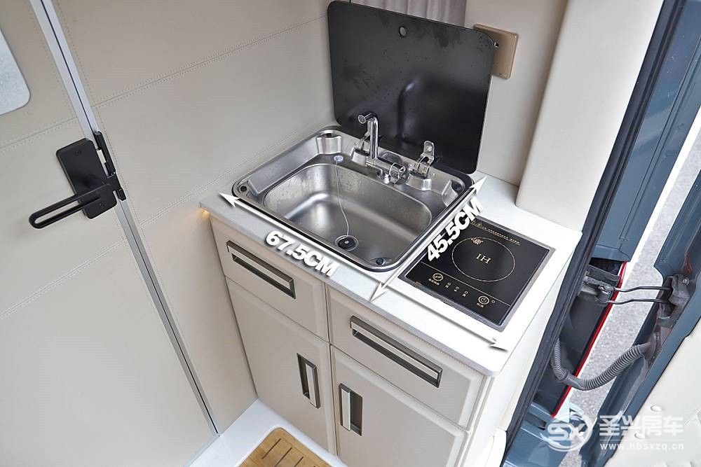 先來看廚房區,操作臺面實測面積為67.5x45.5(cm),內部嵌入了電磁爐和帶蓋洗手池,如果將尾門打開,可為廚房區通風換氣。