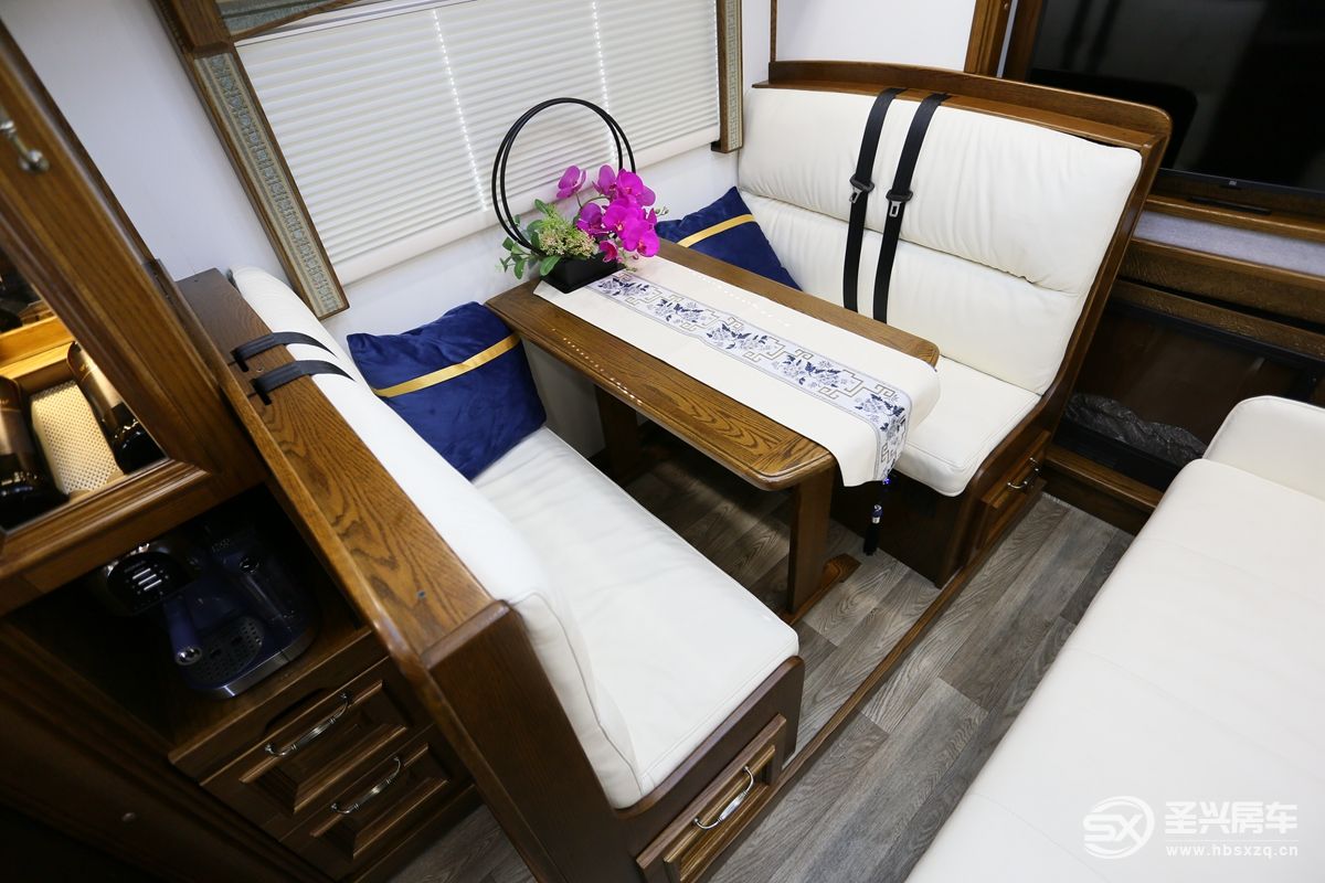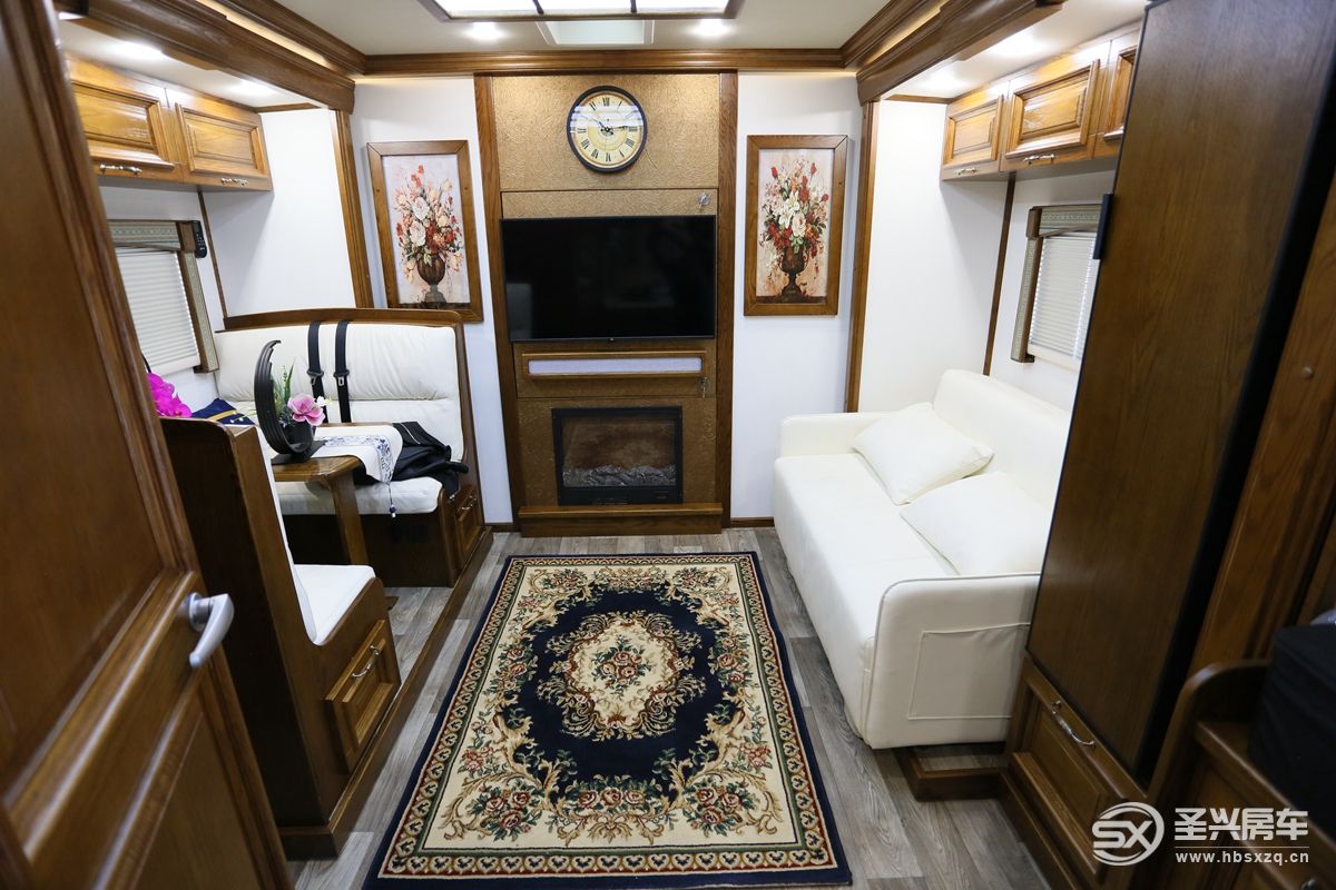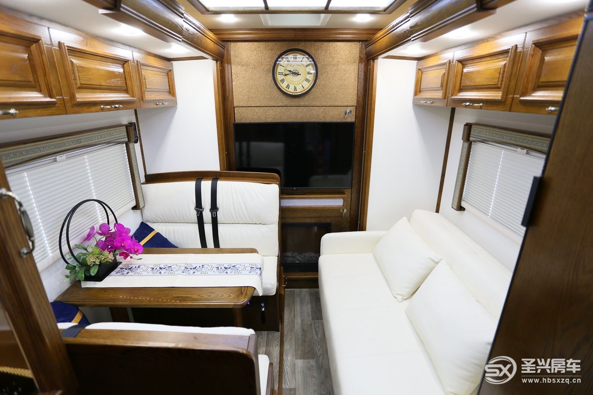 車內(nèi)所見之處全部采用來自美國的紅橡實木家具,波西米亞的裝飾風格更加帶動用戶的情緒,精致、復古的圓形鐘表等也是符合高品質(zhì)生活的必要條件;前部客廳左右兩側(cè)由于有拓展艙的加持,空間方面可以更進一步的增加場景擴展及使用性。娛樂系統(tǒng)主要是一臺43寸超大電視和回音壁智能音響系統(tǒng),電視墻可以打開和駕駛室互通,細節(jié)設(shè)計巧妙,遙控器位于電視下方;特別的是音響下方還有一個營造氛圍感的內(nèi)嵌式壁爐,而且能起到實際供暖作用。