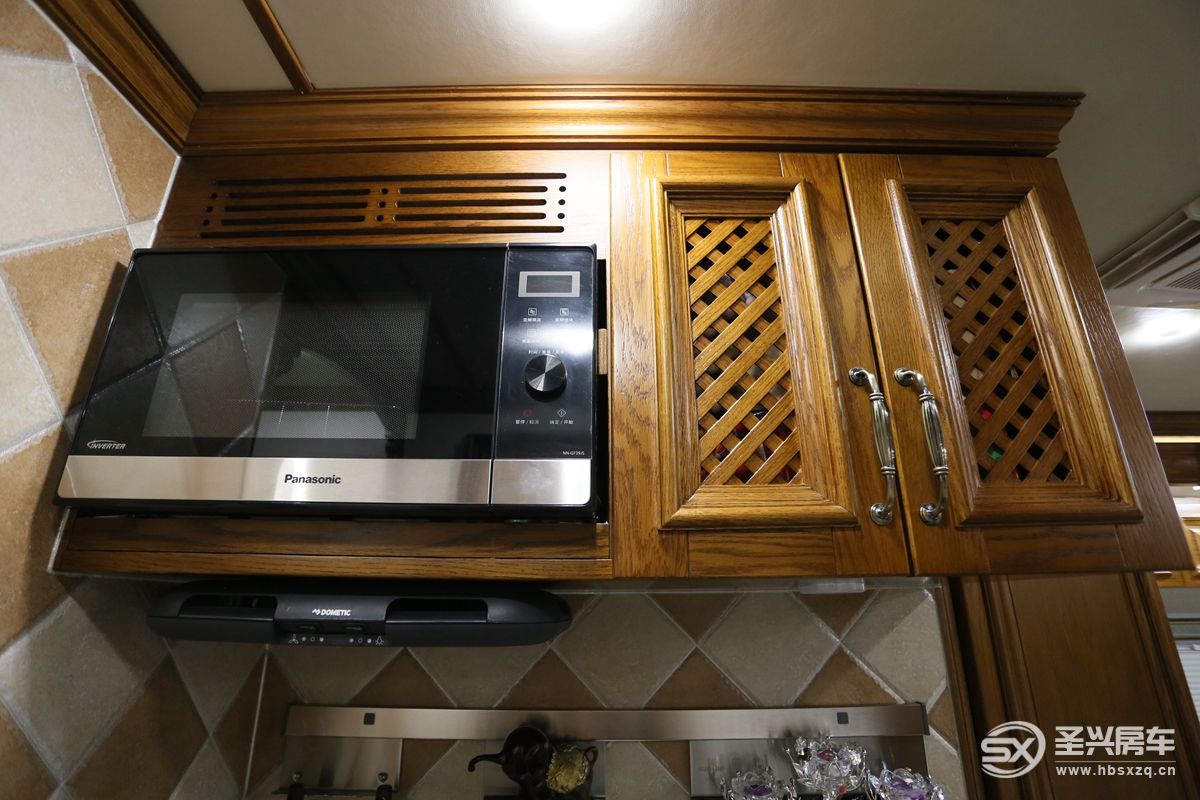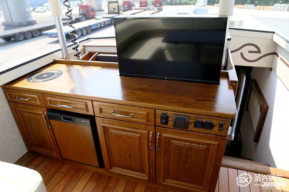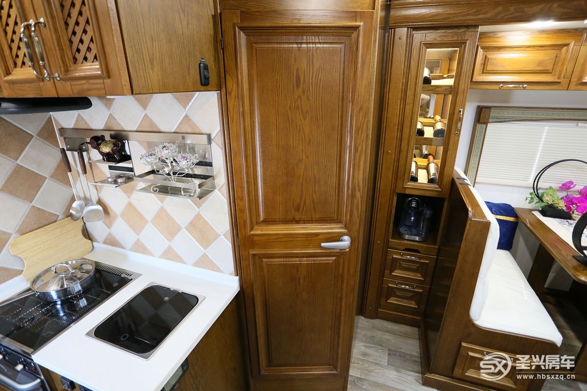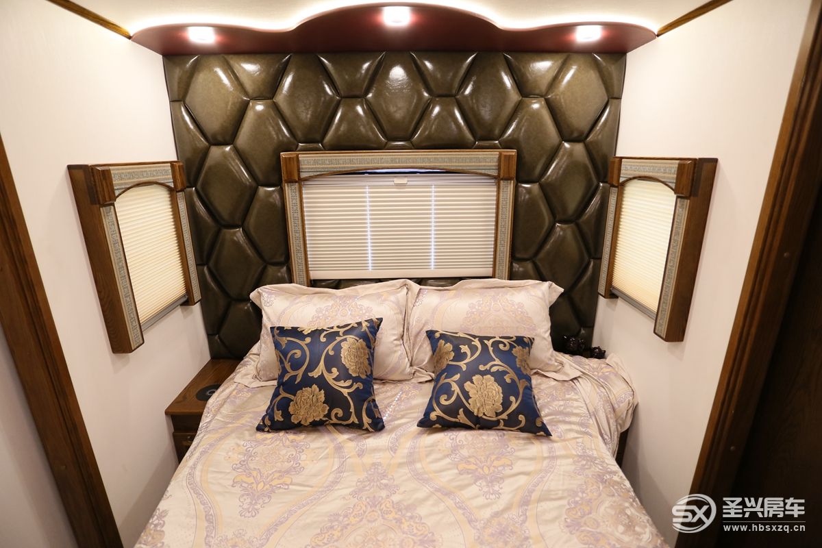 車內(nèi)所見之處全部采用來自美國的紅橡實木家具,波西米亞的裝飾風格更加帶動用戶的情緒,精致、復古的圓形鐘表等也是符合高品質(zhì)生活的必要條件;前部客廳左右兩側(cè)由于有拓展艙的加持,空間方面可以更進一步的增加場景擴展及使用性。娛樂系統(tǒng)主要是一臺43寸超大電視和回音壁智能音響系統(tǒng),電視墻可以打開和駕駛室互通,細節(jié)設(shè)計巧妙,遙控器位于電視下方;特別的是音響下方還有一個營造氛圍感的內(nèi)嵌式壁爐,而且能起到實際供暖作用。