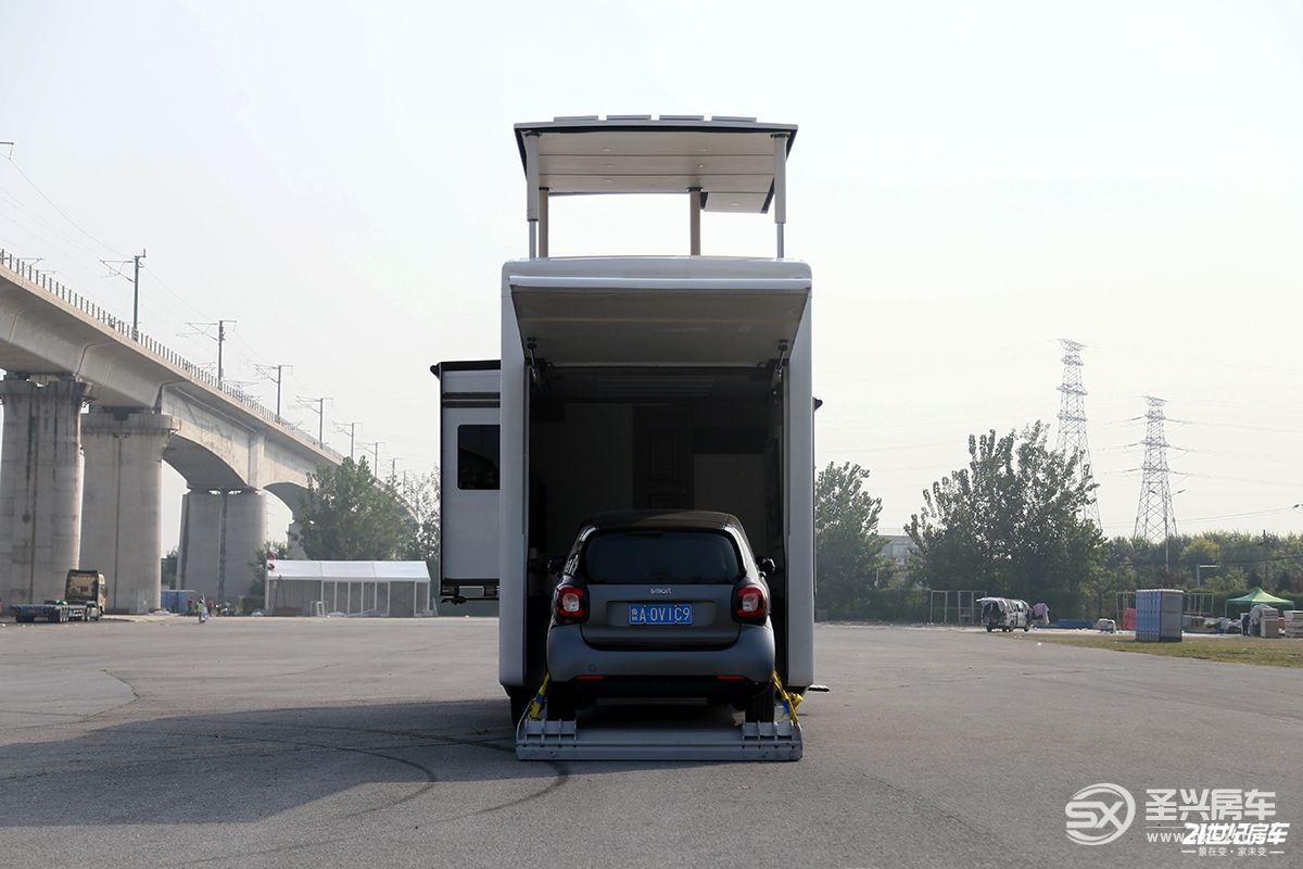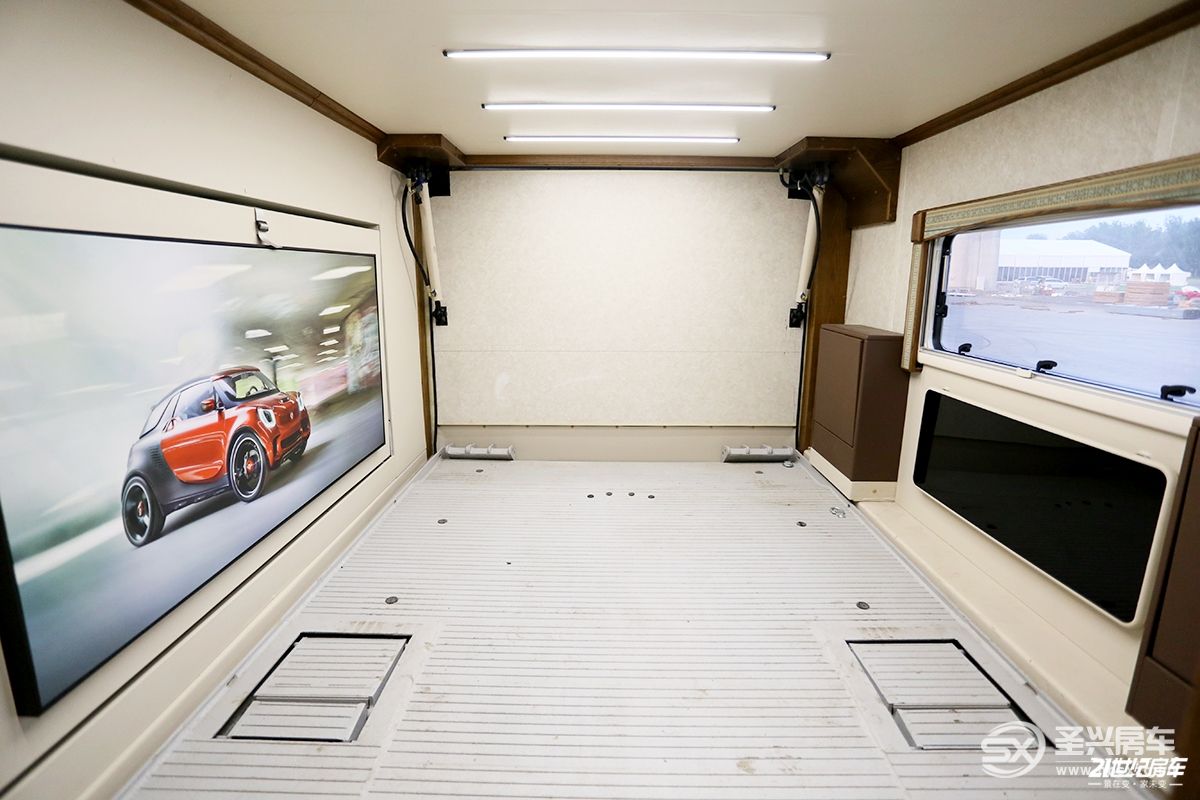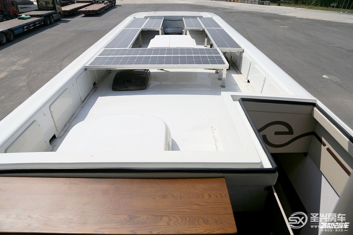 車內(nèi)可以直接從臥室進入車庫,內(nèi)部可以停放一輛奔馳SMART,甚至一些沙灘越野車、摩托車或者自行車等交通工具。電動車庫門一鍵操作,車庫帶有油壓托盤,方便攜帶車輛戶外出行游玩。電力系統(tǒng)方面,包括1600W太陽能板、6kW逆變器、智能電路控制系統(tǒng)及輔助電力系統(tǒng),強大的配置也可以作為儲備鋰電的能量來源,進一步保證車輛日常生活使用的穩(wěn)定供應(yīng)。