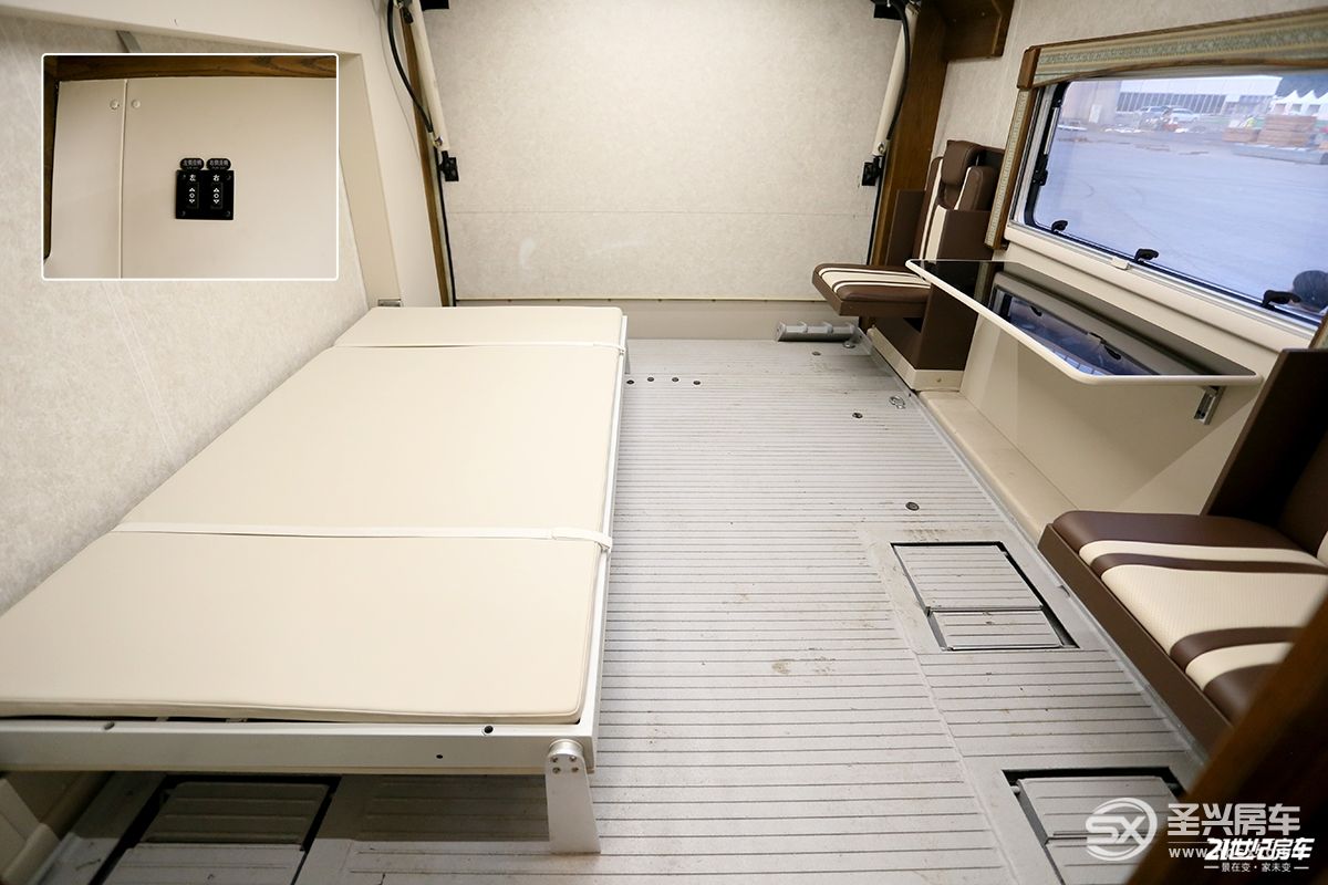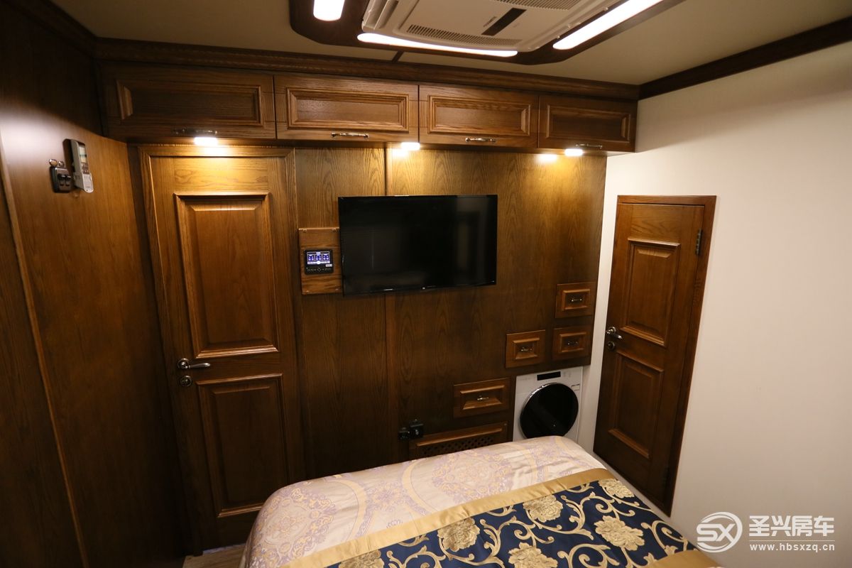 主臥配置包括內(nèi)置空調(diào)、4000W燃油暖風系統(tǒng)、壁掛32寸小米電視、小吉的滾筒洗衣機等。各功能開關(guān)一目了然,電動伸縮床控制開關(guān)位于小米電視旁邊,通過三個動作可手動操作。