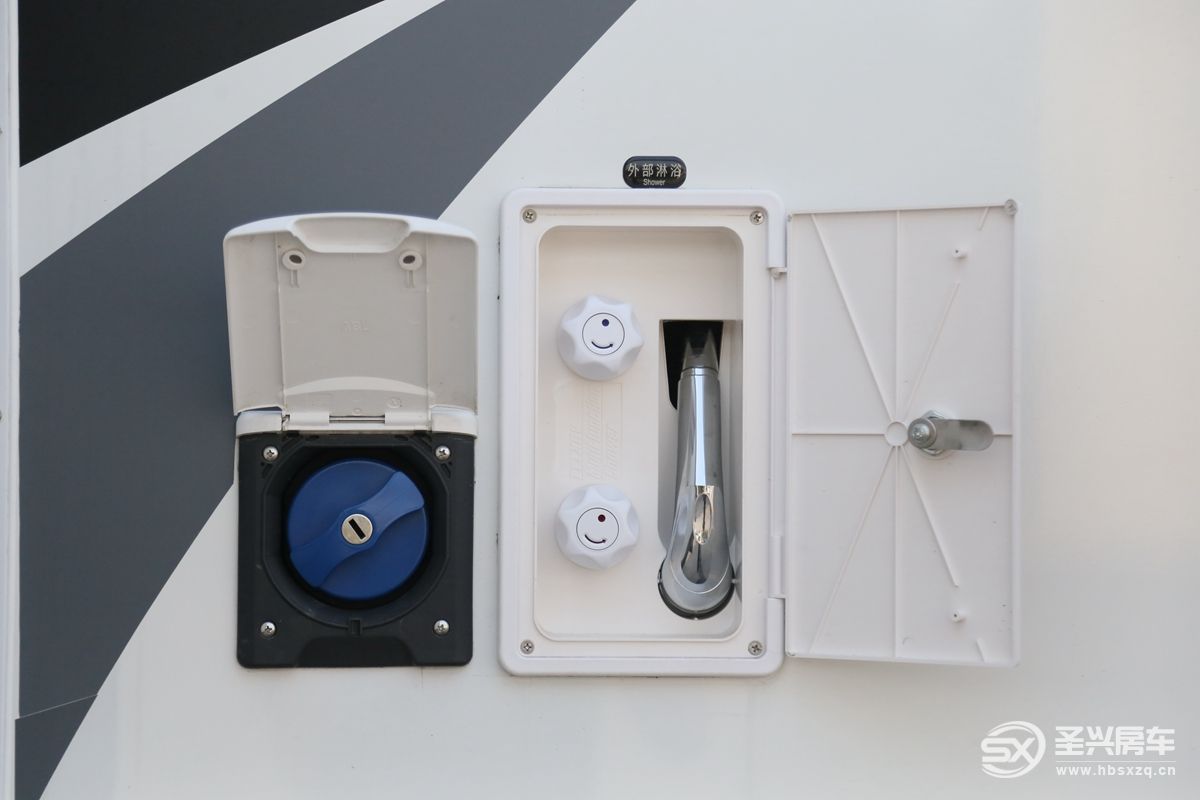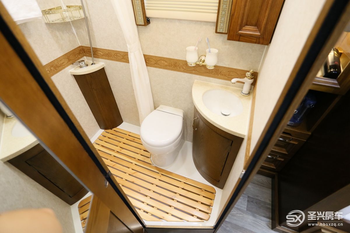 酒柜后方是衛(wèi)生間,衛(wèi)生間燈光開關(guān)位于廚房頂柜外側(cè),使用便捷。衛(wèi)生間內(nèi)部空間非常寬裕,內(nèi)飾布局也很溫馨。地板做了干濕分離,防止意外滑倒;中間由浴簾相隔,可以秒變兩個獨立區(qū)域,洗漱淋浴互不影響;包括進口馬桶、洗手池。梳妝鏡、毛巾架、換氣扇、抽拉一體式淋浴花灑等;水路方面,310L凈水箱、190L灰水箱、100L黑水箱,搭配12V水泵和雙能源熱水器。
