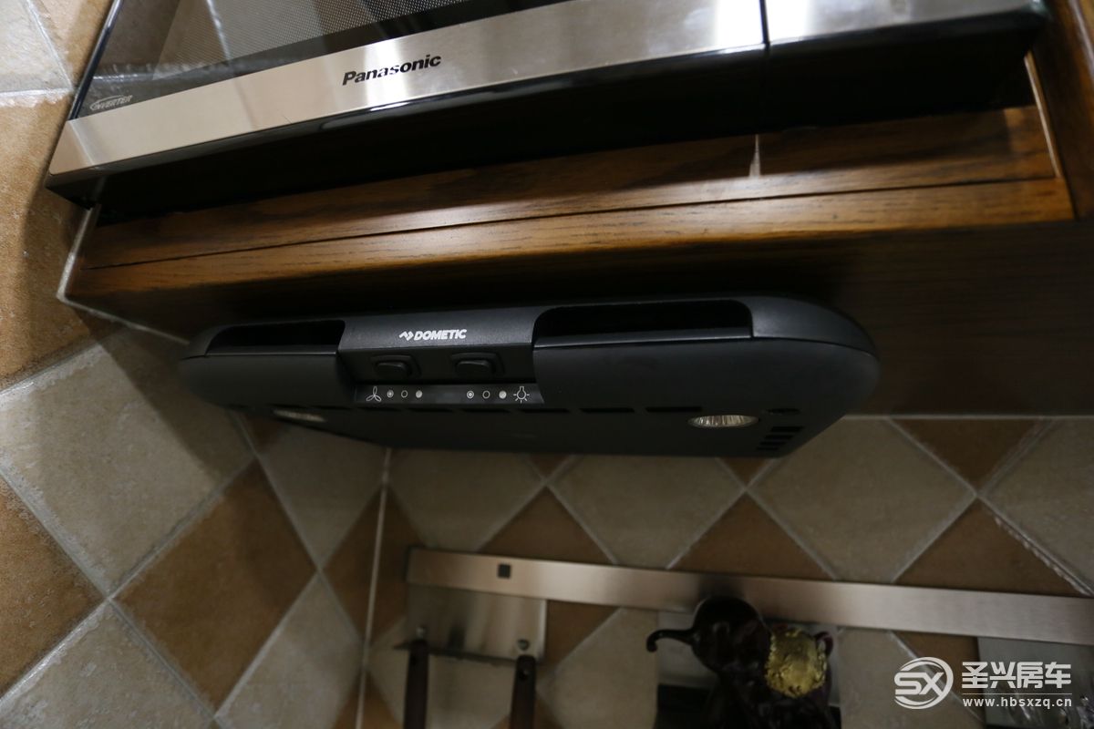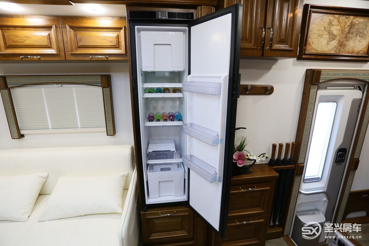 沙發(fā)旁邊152升的超大冰箱、冷藏冷凍都可以,滿足長期旅行的食材儲備需求;另外,多美達頂置空調(diào)以及雙氣流換氣扇能夠有效保障車廂內(nèi)空氣流通。旁邊吊柜內(nèi)部是前部會客區(qū)左右兩側(cè)拓展機構(gòu)的開關(guān)及燈光等功能。