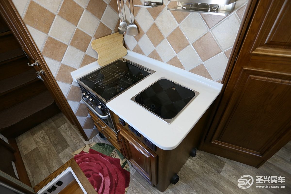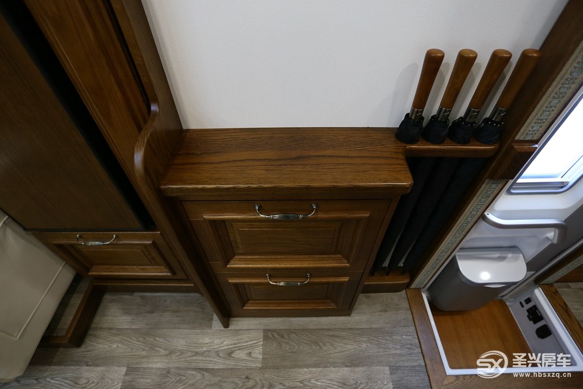 進入車廂內(nèi)部,門口旁邊很貼心的帶有雨傘支架,地板凹槽設(shè)計,內(nèi)部是踏步、遮陽棚及戶外燈開關(guān)。旁邊還設(shè)計有地板蓋板,設(shè)計貼心,防止踩空摔倒,也利于廚房區(qū)更好的活動。