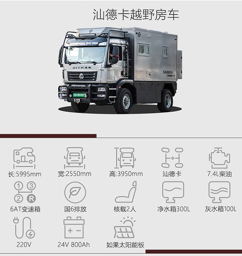 汕德卡的長/寬/高分別為5995x2550x3950(mm),C本即可駕馭。動力上,汕德卡搭載7.4L直列6缸柴油發動機,峰值扭矩可以達到1400牛·米,與其匹配的是6擋自動變速箱,底盤位置新車裝配有空氣懸架,可以提升舒適性,四驅系統還能適應一定強度的越野環境。