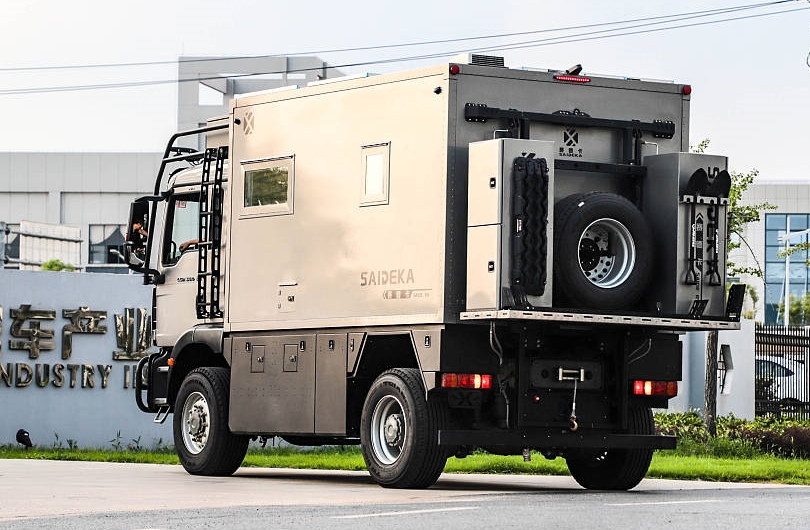 車側提供多組小型儲物艙,一些維修工具、零碎行李可以放在內部,戶外露營配置包括電動遮陽棚、戶外柴油灶等。注水口和新能源市電接口也設置在車側位置。