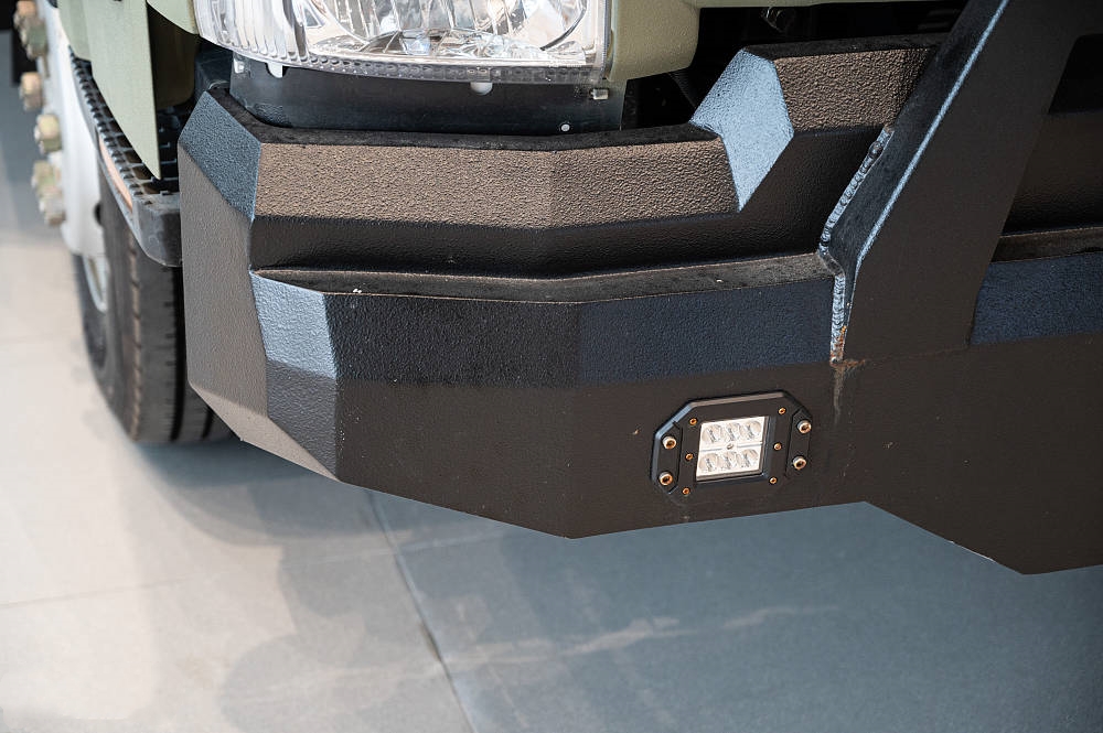 車頭部分配有遠近光大燈、霧燈和額頭處越野LED探照燈,探照大燈是一種特殊的燈光裝置可向前方發(fā)出高強度遠射光線,照亮前方的道路和環(huán)境增加駕駛的安全性,在野外或者霧霾天氣等低視野條件下,提供足夠的照明,讓駕駛者能夠清楚地看到前方的路況和障礙物,避免發(fā)生碰撞和事故。